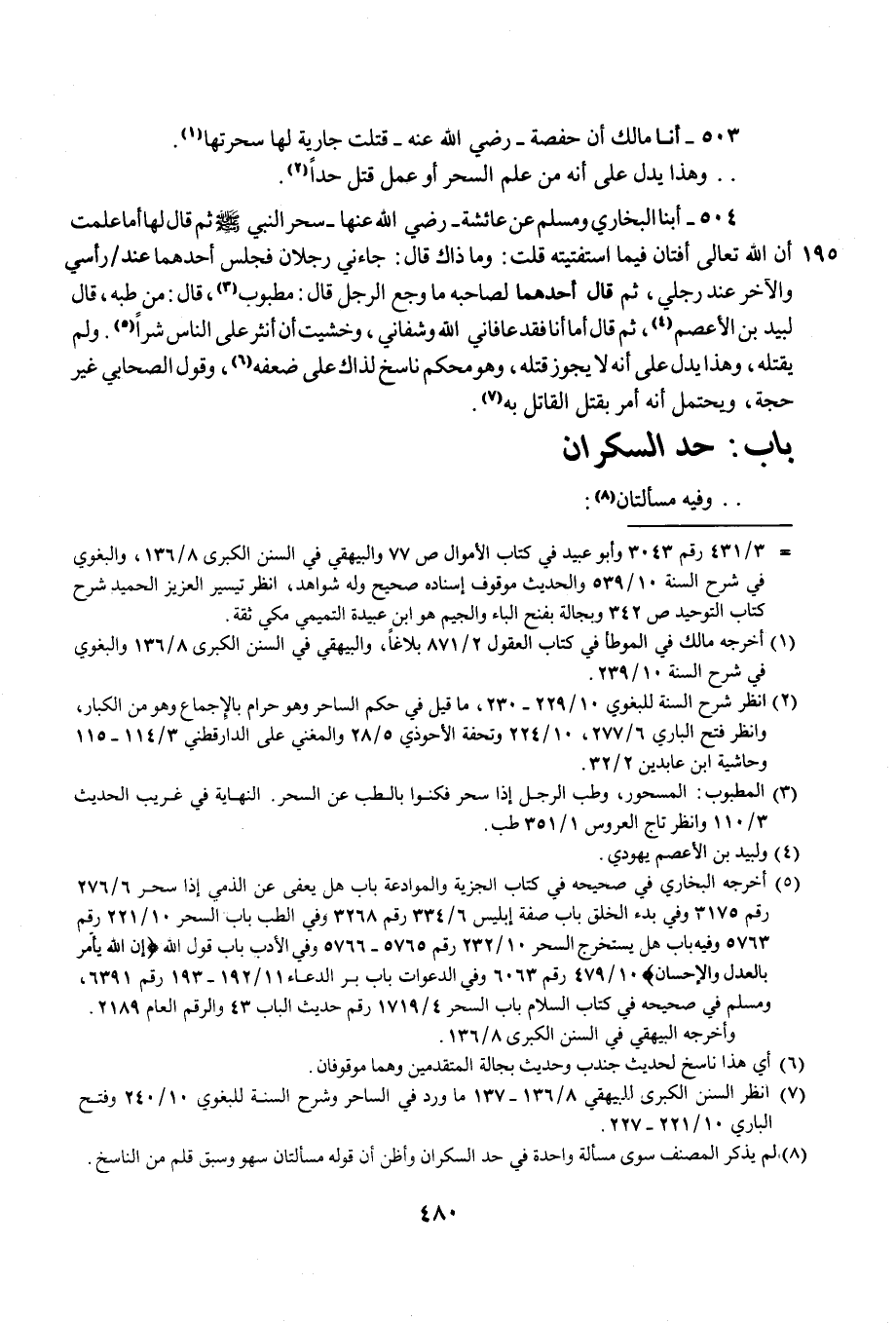 (¬7) انظر السنن الكبري للبيهقي 8/ 136 - 137 ما ورد في الساحر وشرح السنة للبغوي 10/ 240 وفتح الباري 10/ 221 - 227.