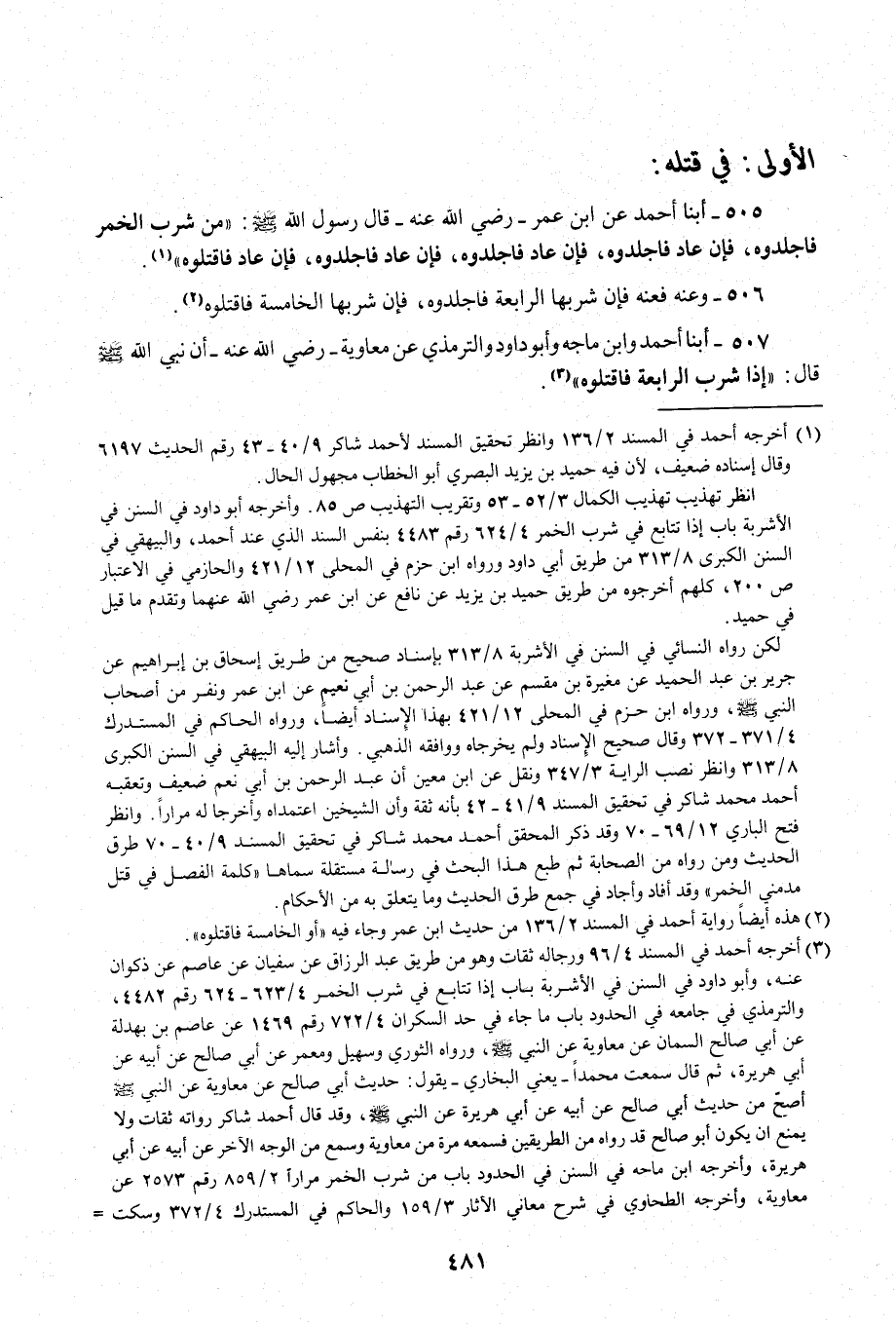 505 - أبنا أحمد عن ابن عمر- رضي الله عنه- قال رسول الله - صلى الله عليه وسلم -: "من شرب الخمر فاجلدوه، فإن عاد فاجلدوه، فإن عاد فاجلدوه، فإن عاد فاجلدوه، فإن عاد فاقتلوه" (¬1).