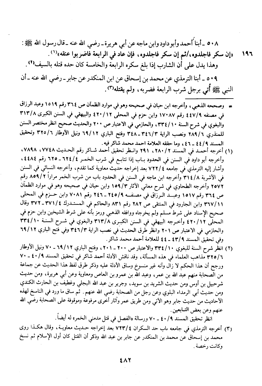 انظر تحقيق المسند 9/ 40 - 70 ورسالة "الفصل في قتل مدمني الخمر" له أيضًا.