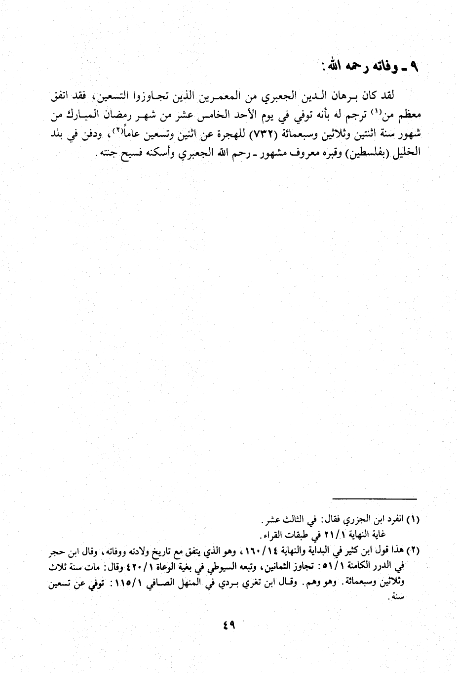 لقد كان برهان الدين الجعبري من المعمرين الذين تجاوزوا التسعين، فقد اتفق معظم من (¬1) ترجم له بأنه توفي في يوم الأحد الخامس عشر من شهر رمضان المبارك من شهور سنة اثنتين وثلاثين وسبعمائة (732) للهجرة عن اثنين وتسعين عامًا (¬2)، ودفن في بلد الخليل (بفلسطين) وقبره معروف مشهور - رحم الله الجعبري وأسكنه فسيح جنته.