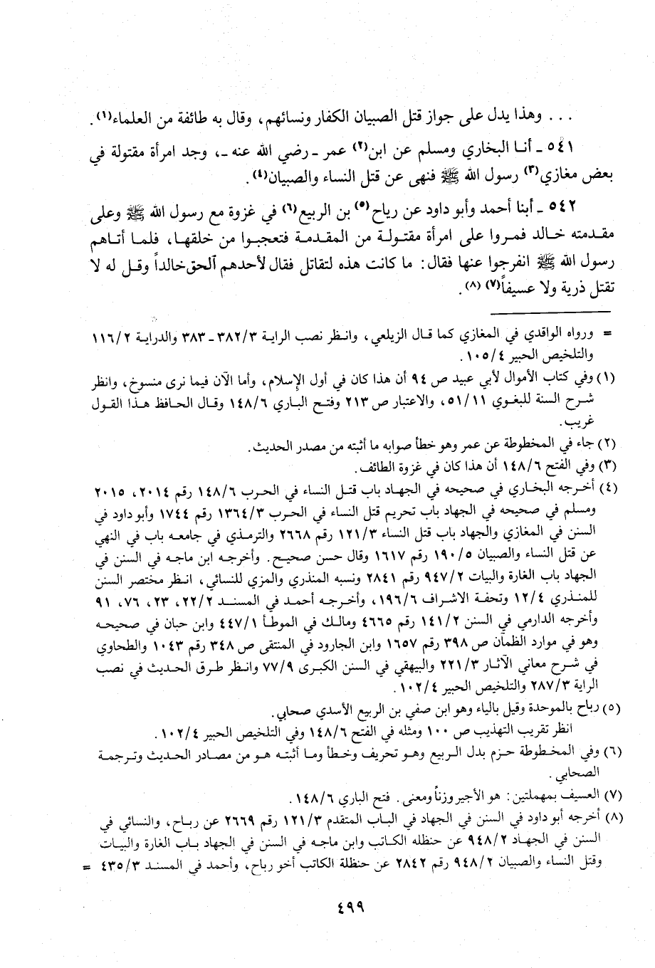 542 - أبنا أحمد وأبو داود عن رياح (¬5) بن الربيع (¬6) في غزوة مع رسول الله - صلى الله عليه وسلم - وعلى مقدمته خالد فمروا على امرأة مقتولة من المقدمة فتعجبوا من خلقها، فلما أتاهم رسول الله - صلى الله عليه وسلم - انفرجوا عنها فقال: ما كانت هذه لتقاتل فقال لأحدهم الحق خالدًا وقل له لا تقتل ذرية ولا عسيفًا (¬7) (¬8).