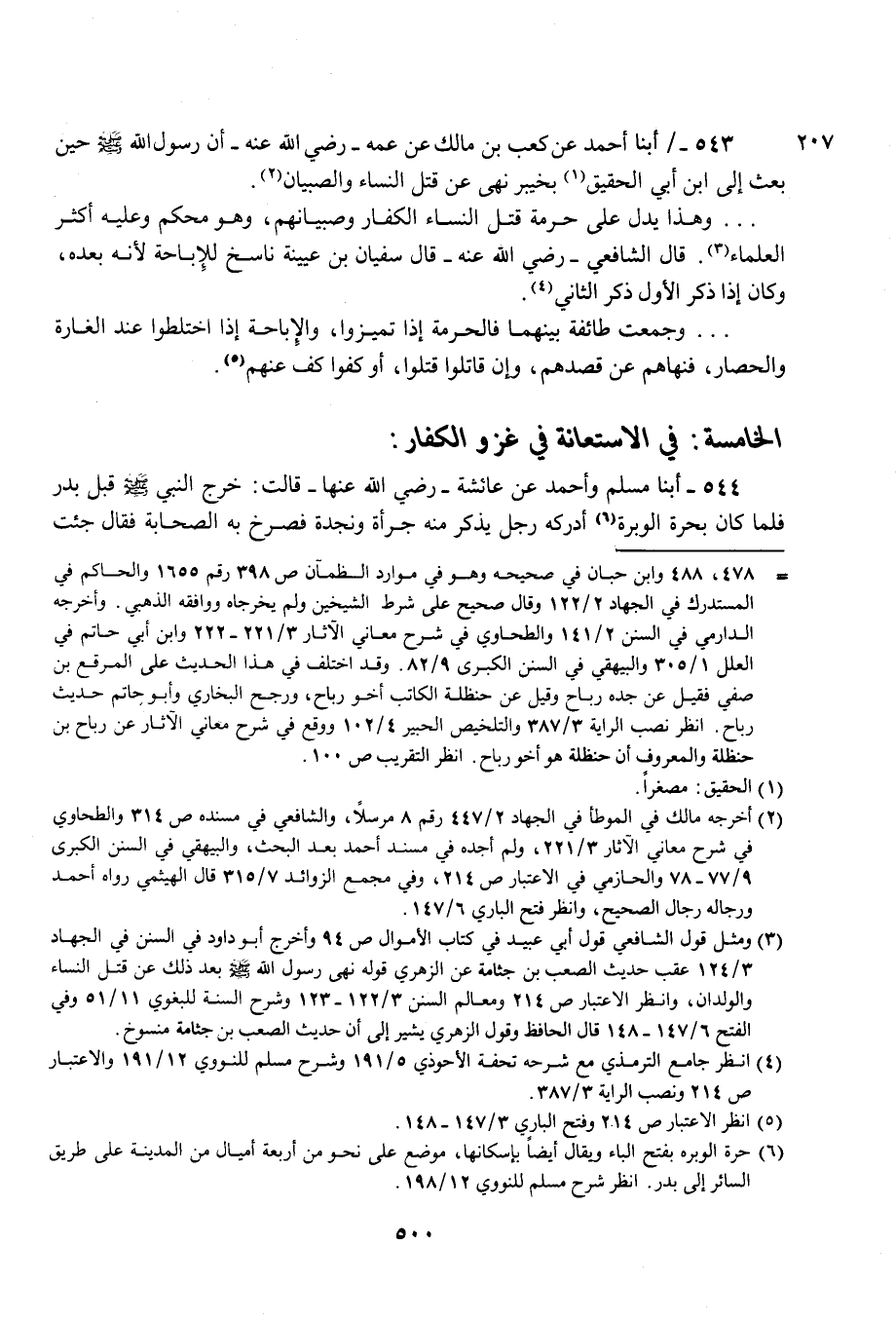 543 - أبنا أحمد عن كعب بن مالك عن عمه- رضي الله عنه- أن رسول الله - صلى الله عليه وسلم - حين بعث إلى ابن أبي الحقيق (¬1) بخيبر نهى عن قتل النساء والصبيان (¬2).