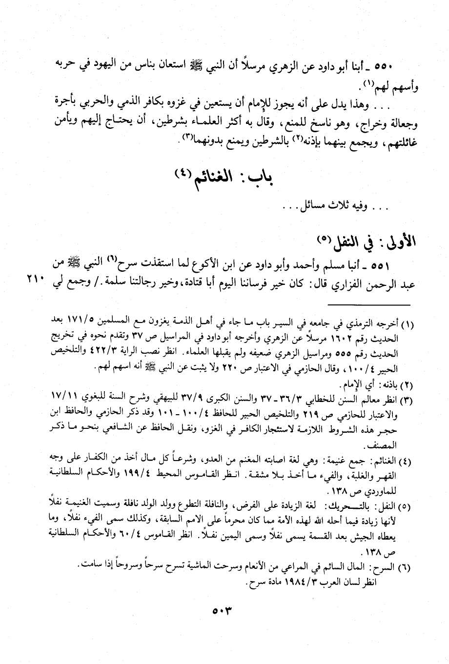 550 - أبنا أبو داود عن الزهري مرسلًا أن النبي -صلى الله عليه وسلم- استعان بناس من اليهود في حربه وأسهم لهم (¬1).