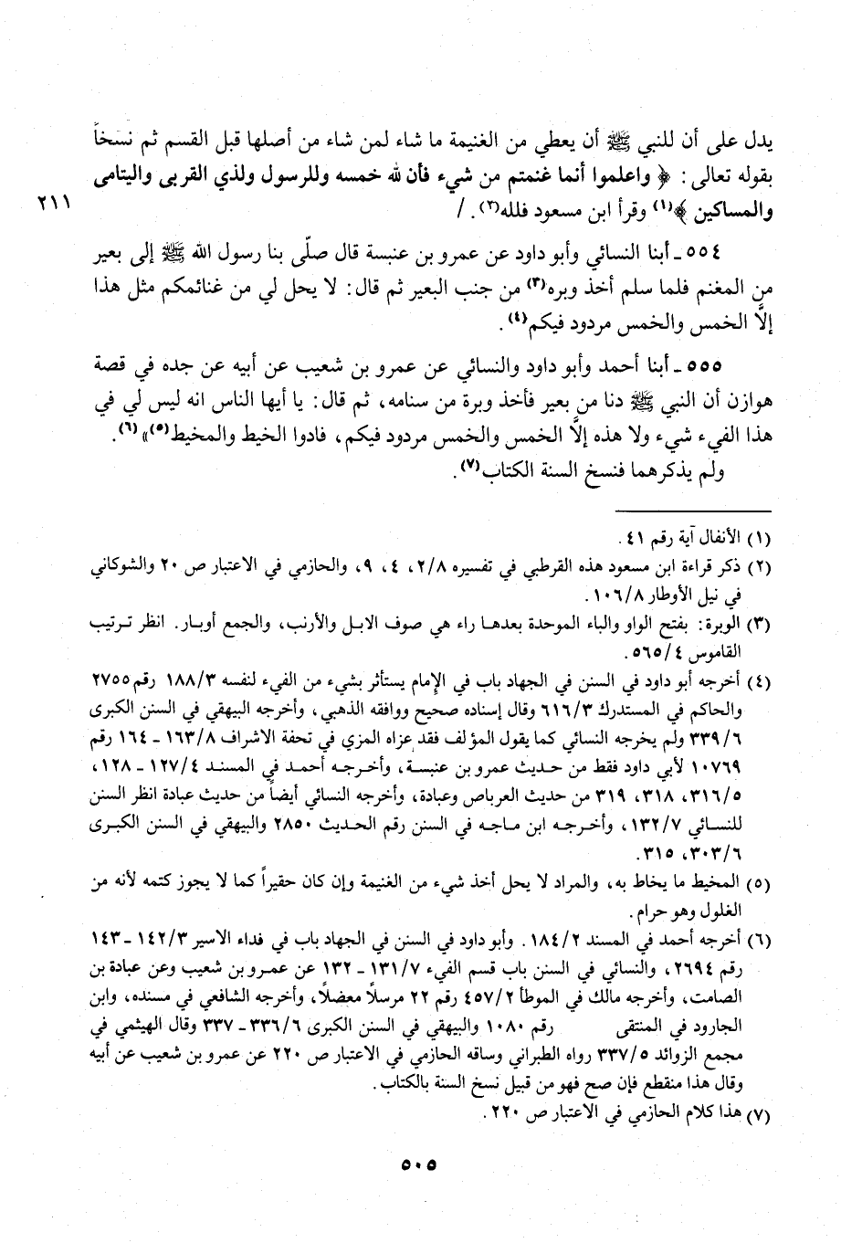 554 - أبنا النسائي وأبو داود عن عمرو بن عنبسة قال صلّى بنا رسول الله -صلى الله عليه وسلم- إلى بعير من المغنم فلما سلم أخذ وبره (¬3) من جنب البعير ثم قال: لا يحل لي من غنائمكم مثل هذا إلَّا الخمس والخمس مردود فيكم (¬4).