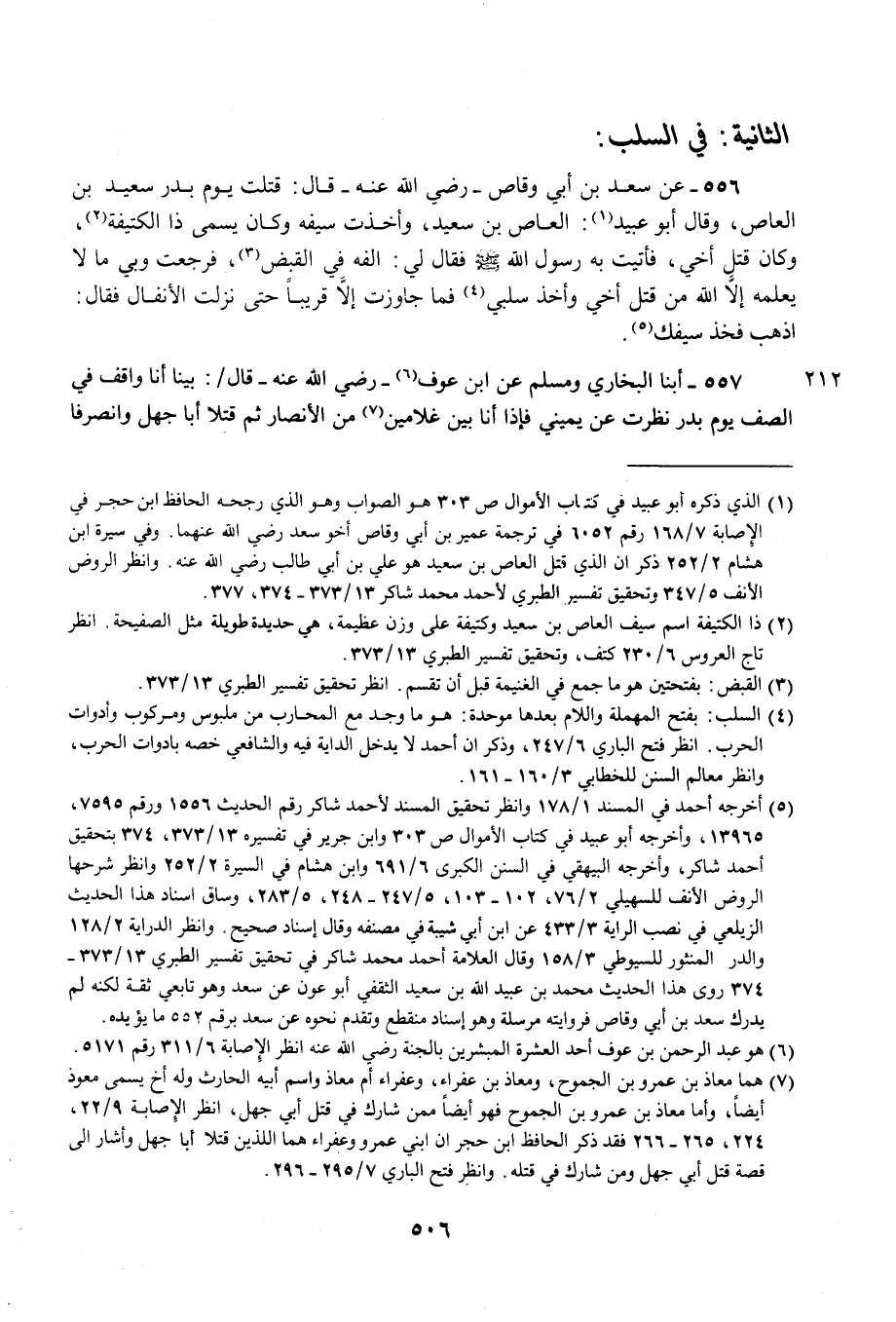 (¬1) الَّذي ذكره أبو عبيد في كتاب الأموال ص 303 هو الصواب وهو الَّذي رجحه الحافظ ابن حجر في الإِصابة 7/ 168 رقم 6052 في ترجمة عمير بن أبي وقاص أخو سعد رضي الله عنهما. وفي سيرة ابن هشام 2/ 252 ذكر ان الَّذي قتل العاص بن سعيد هو علي بن أبي طالب رضي الله عنه. وانظر الروض الأنف 5/ 347 وتحقيق تفسير الطبري لأحمد محمد شاكر 13/ 373 - 374، 377.
