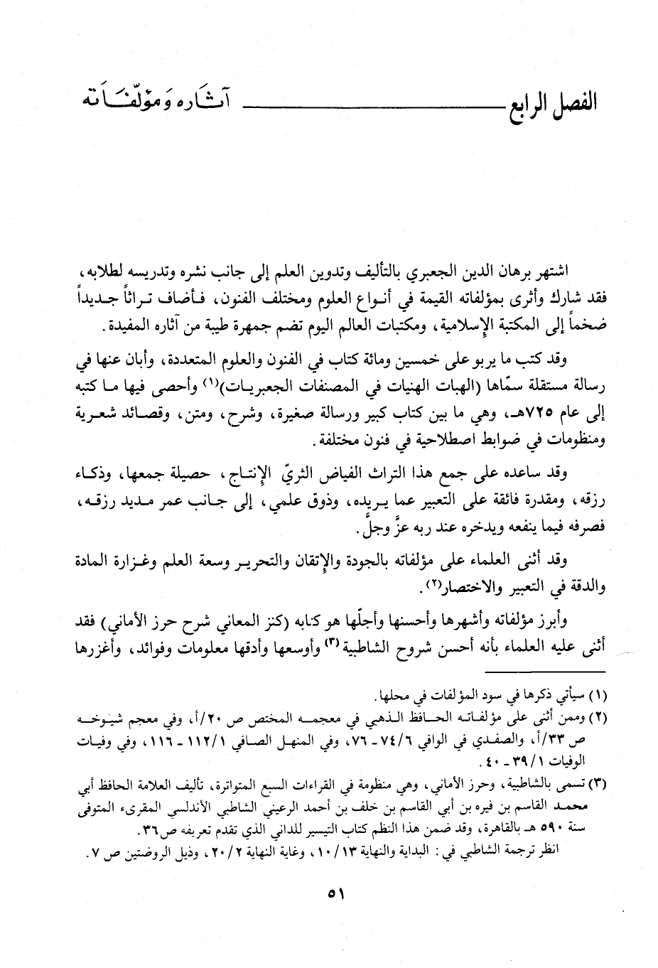 وقد كتب ما يربو على خمسين ومائة كتاب في الفنون والعلوم المتعددة، وأبان عنها في رسالة مستقلة سمّاها (الهبات الهنيات في المصنفات الجعبريات) (¬1) وأحصى فيها ما كتبه إلى عام 725 هـ، وهي ما بين كتاب كبير ورسالة صغيرة، وشرح، ومتن، وقصائد شعرية ومنظومات في ضوابط اصطلاحية في فنون مختلفة.