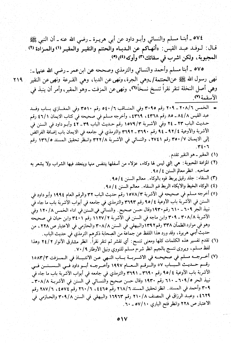 575 - أبنا مسلم وأحمد والنسائي والترمذي وصححه عن ابن عمر -رضي الله عنهما-: نهى رسول الله - صلى الله عليه وسلم - عن الحنتمة، وهي الجرة، ونهى عن الدبا، وهي القرعة ونهى عن النقير وهي أصل النخلة تنقر نقرًا تنسخ نسخًا (¬6)، ونهى عن المزفت - وهو المقير، وأمر أن ينبذ في الأسقمة (¬7).