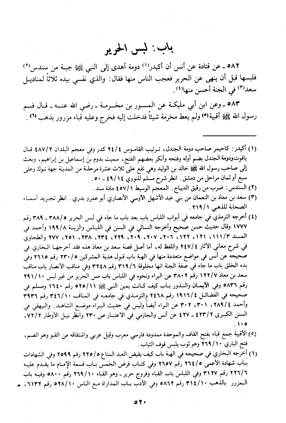 582 - عن قتادة عن أنس أن أكيدر (¬1) دومة أهدى إلى النبي - صلى الله عليه وسلم - جبة من سندس (¬2) فلبسها قبل أن ينهى عن الحرير فعجب الناس منها فقال: والذي نفسي بيده ثلاثًا لمناديل سعد (¬3) في الجنَّة أحسن منها (¬4).