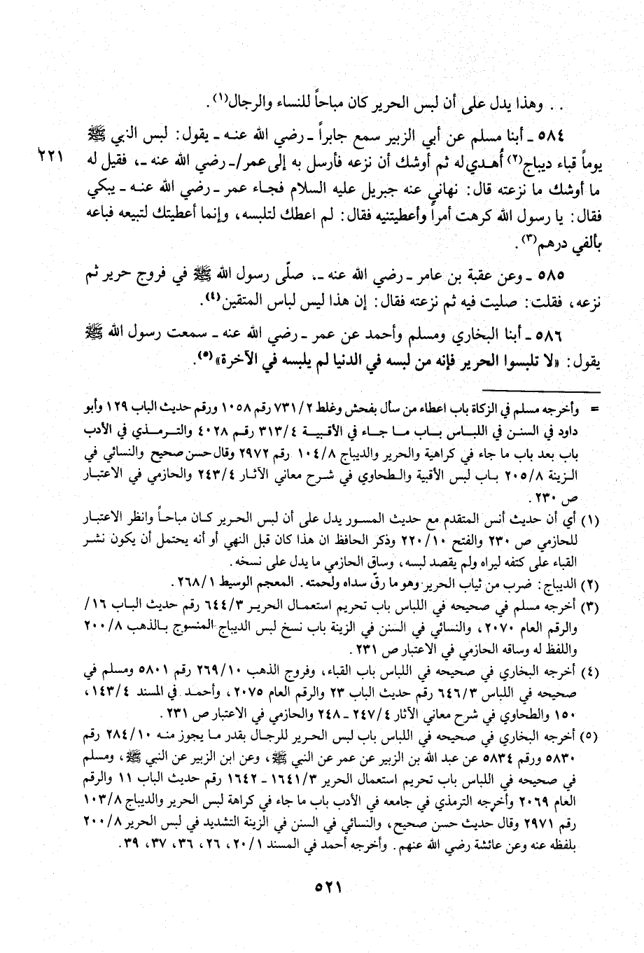 586 - أبنا البخاري ومسلم وأحمد عن عمر - رضي الله عنه - سمعت رسول الله - صلى الله عليه وسلم - يقول: "لا تلبسوا الحرير فإنه من لبسه في الدنيا لم يلبسه في الآخرة" (¬5).