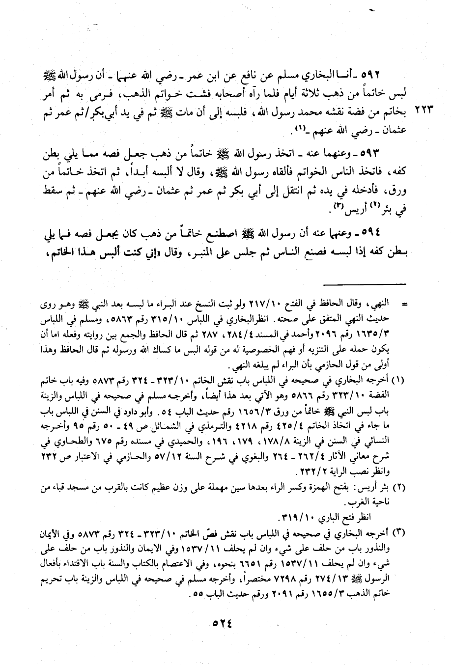 (¬3) أخرجه البخاري في صحيحه في اللباس باب نقش فصّ الخاتم 10/ 323 - 324 رقم 5873 وفي الأيمان والنذور باب من حلف على شيء وإن لم يحلف 11/ 1537 وفي الأيمان والنذوز باب من حلف على شيء وإن لم يحلف 11/ 1537 رقم 6651 بنحوه، وفي الاعتصام بالكتاب والسنة باب الاقتداء بأفعال الرسول - صلى الله عليه وسلم - 13/ 274 رقم 7298 مختصرًا، وأخرجه مسلم في صحيحه في اللباس والزينة باب تحريم خاتم الذهب 3/ 1655 رقم 2091 ورقم حديث الباب 55.