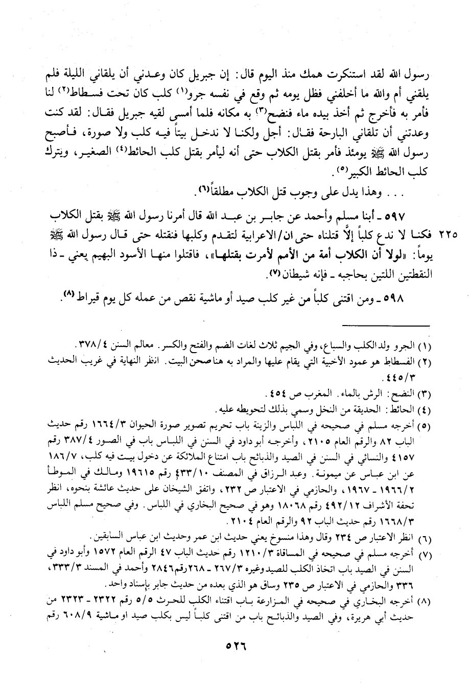 (¬8) أخرجه البخاري في صحيحه في المزارعة باب اقتناء الكلب للحرث 5/ 5 رقم 2322 - 2323 من حديث أبي هريرة، وفي الصيد والذبائح باب من اقتنى كلبًا ليس بكلب صيد أو ماشية 9/ 608 رقم