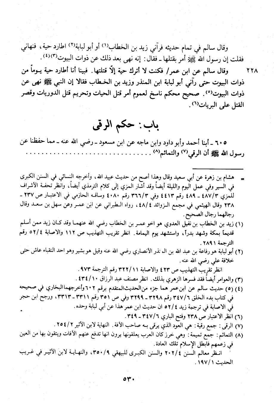 وقال سالم عن ابن عمر فكنت لا أترك حية إلَّا قتلتها. فبينا أنا أطارد حية يومًا من ذوات البيوت حتَّى رآني أبو لبابة ابن المنذر وزيد بن الخطاب فقالا إن النبي - صلى الله عليه وسلم - نهى عن ذوات البيوت (¬5). صحيح محكم ناصح لعموم أمر قتل الحيات وتحريم قتل الدوريات وقصر القتل على البريات (¬6).