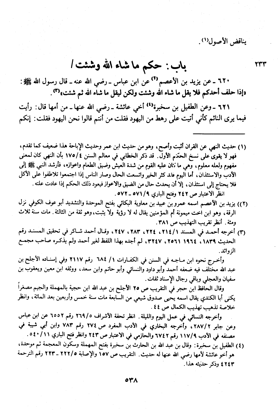 620 - عن يزيد بن الأعصم (¬2) عن ابن عباس - رضي الله عنه - قال رسول الله - صلى الله عليه وسلم -: "إذا حلف أحدكم فلا يقل ما شاء الله وشئت ولكن ليقل ما شاء الله ثم شئت" (¬3).