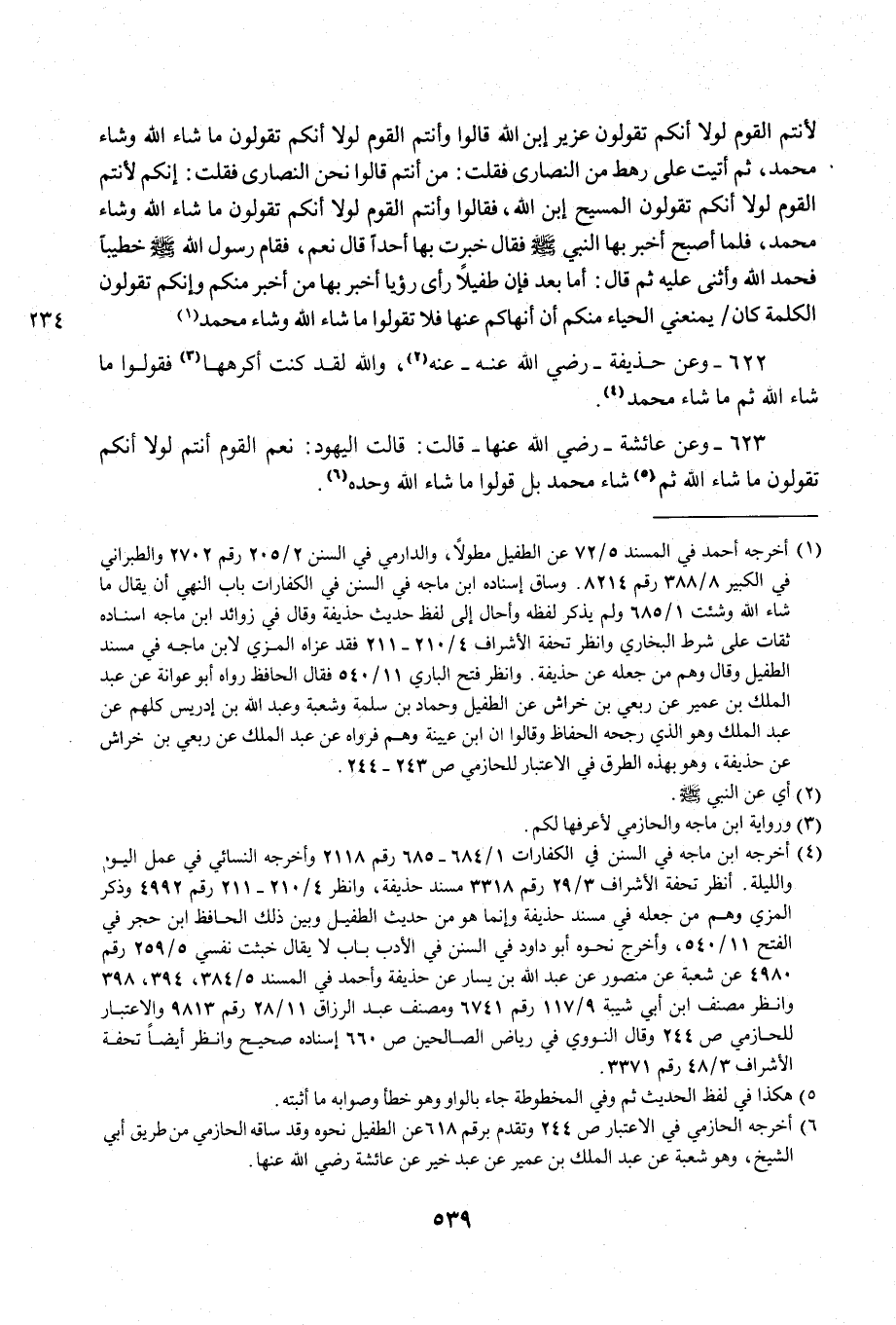 622 - وعن حذيفة - رضي الله عنه - عنه (¬2)، والله لقد كنت أكرهها (¬3) فقولوا ما شاء الله ثم ما شاء محمد (¬4).