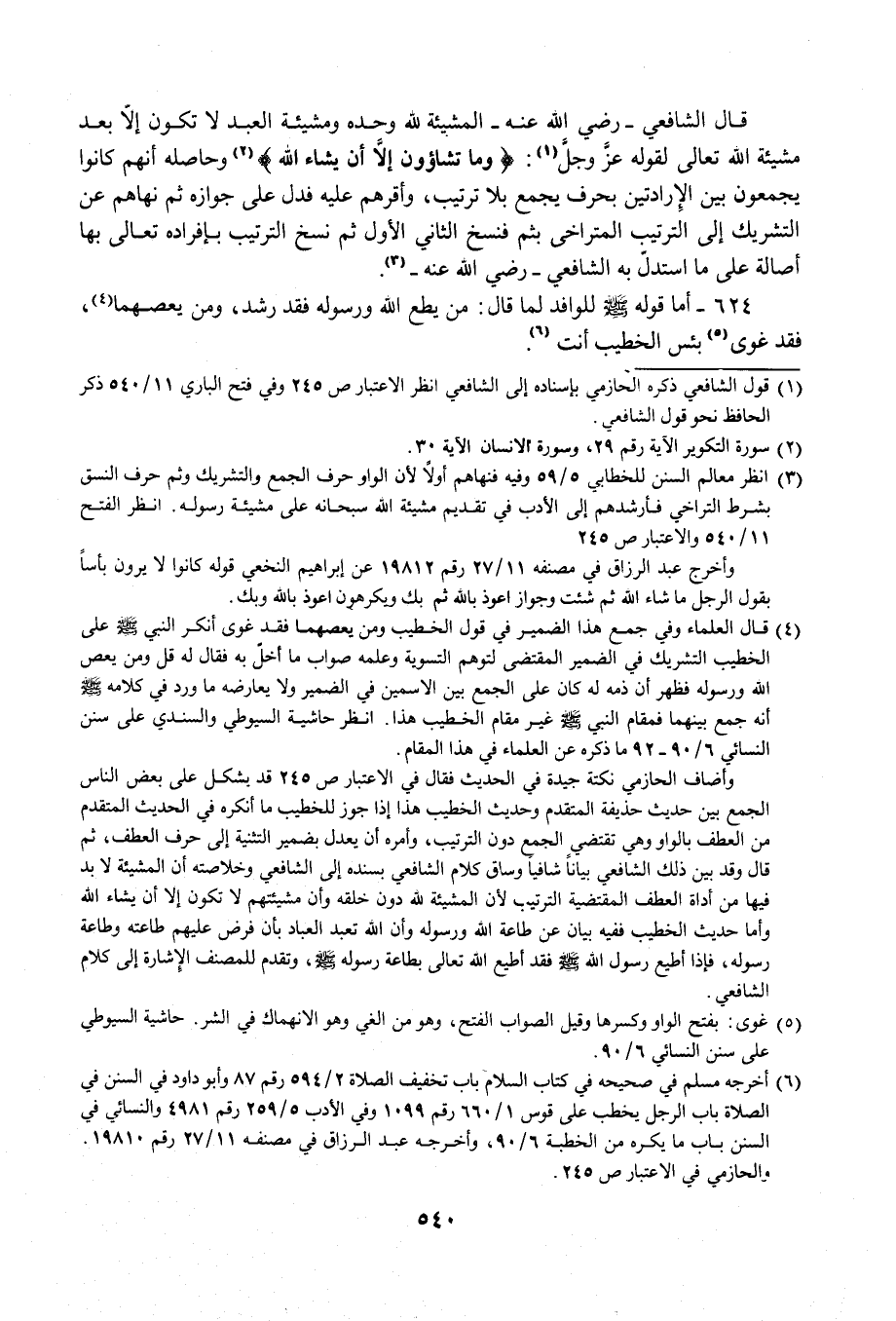 وأضاف الحازمي نكتة جيدة في الحديث فقال في الاعتبار ص 245 قد يشكل على بعض الناس الجمع بين حديث حذيفة المتقدم وحديث الخطيب هذا إذا جوز للخطيب ما أنكره في الحديث المتقدم من العطف بالواو وهي تقتضي الجمع دون الترتيب، وأمره أن يعدل بضمير التثنية إلى حرف العطف، ثم قال وقد بين ذلك الشافعي بيانًا شافيًا وساق كلام الشافعي بسنده إلى الشافعي وخلاصته أن المشيئة لا بد فيها من أداة العطف المقتضية الترتيب لأن المشيئة لله دون خلقه وأن مشيئتهم لا تكون إلا أن يشاء الله وأما حديث الخطيب ففيه بيان عن طاعة الله ورسوله وأن الله تعبد العباد بأن فرض عليهم طاعته وطاعة رسوله، فإذا أطيع رسول الله - صلى الله عليه وسلم - فقد أطيع الله تعالى بطاعة رسوله - صلى الله عليه وسلم -، وتقدم للمصنف الإِشارة إلى كلام الشافعي.