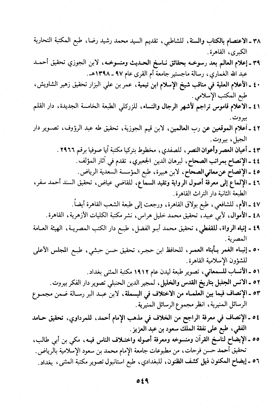 38 - الاعتصام بالكتاب والسنة، للشاطبي، تقديم السيد محمد رشيد رضا، طبع المكتبة التحارية الكبرى، القاهرة.