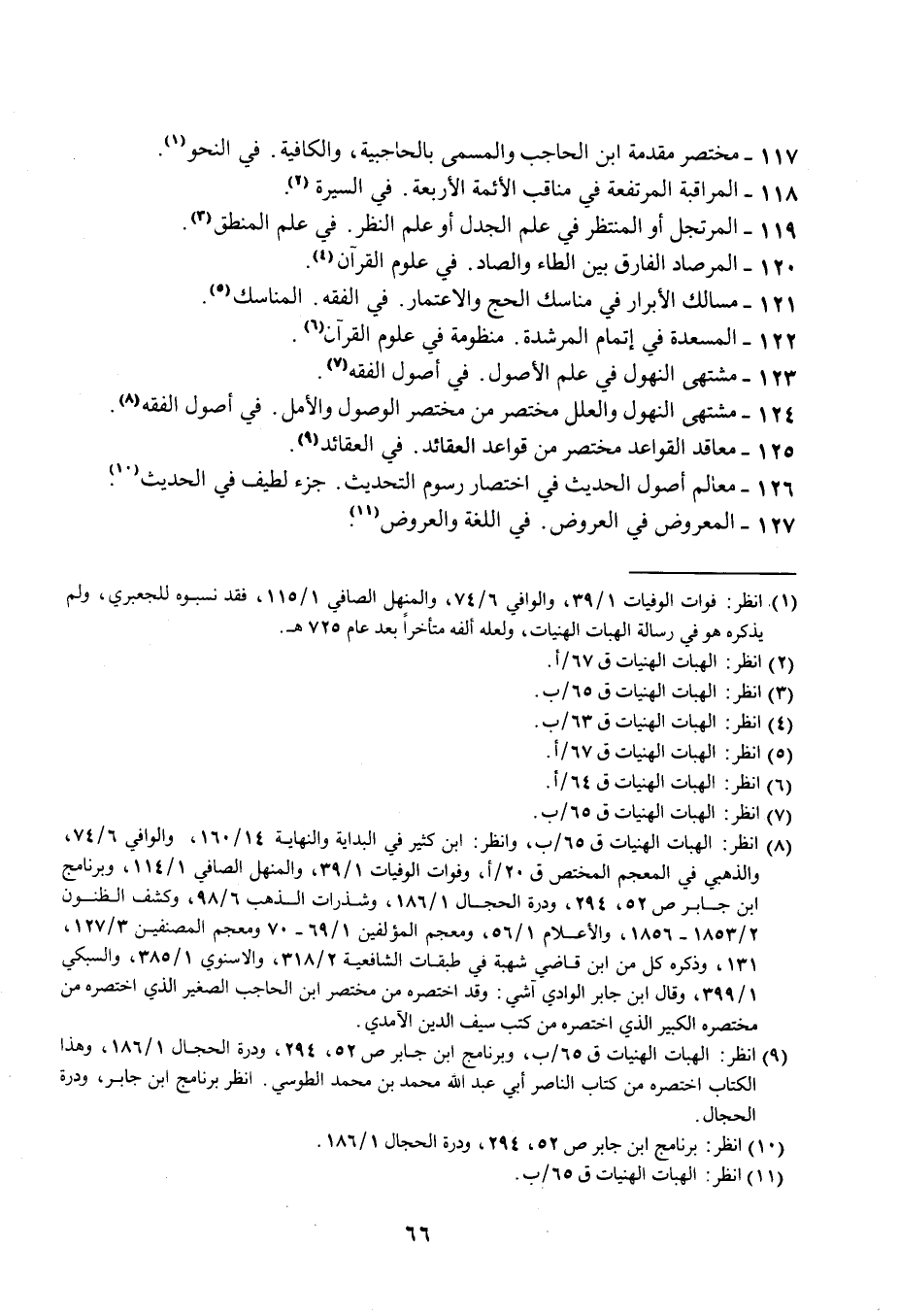 (¬8) انظر: الهبات الهنيات ق 65/ ب، وانظر: ابن كثير في البداية والنهاية 14/ 160، والواقي 6/ 74، والذهبي في المعجم المختص ق 20/ أ، وفوات الوفيات 1/ 39، والمنهل الصافي 1/ 114، وبرنامج ابن جابر ص 52، 294، ودرة الحجال 1/ 186، وشذرات الذهب 6/ 98، وكشف الظنون 2/ 1853 - 1856، والأعلام 1/ 56، ومعجم المؤلفين 1/ 69 - 70 ومعجم المصنفين 3/ 127، 131، وذكره كل من ابن قاضي شهبة في طبقات الشافعية 2/ 318، والإسنوي 1/ 385، والسبكي 1/ 399، وقال ابن جابر الوادي آشي: وقد اختصره من مختصر ابن الحاجب الصغير الذي اختصره من مختصره الكبير الذي اختصره من كتب سيف الدين الآمدي.