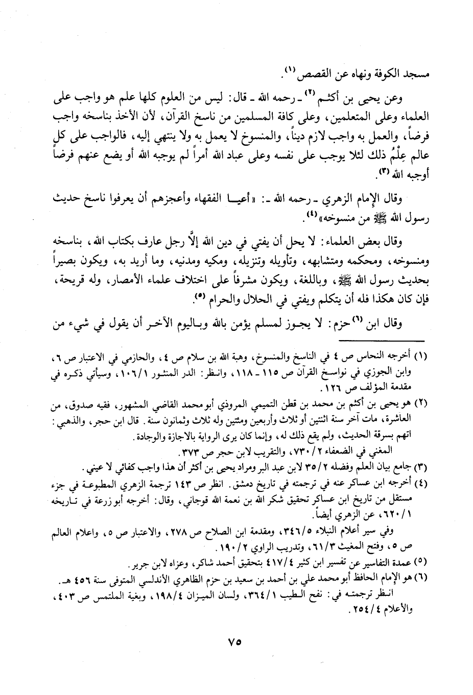وعن يحيى بن أكثم (¬2) -رحمه الله- قال: ليس من العلوم كلها علم هو واجب على العلماء وعلى المتعلمين، وعلى كافة المسلمين من ناسخ القرآن, لأن الأخذ بناسخه واجب فرضًا، والعمل به واجب لازم دينًا، والمنسوخ لا يعمل به ولا ينتهي إليه، فالواجب على كل عالم عِلْمُ ذلك لئلا يوجب على نفسه وعلى عباد الله أمرًا لم يوجبه الله أو يضع عنهم فرضًا أوجبه الله (¬3).