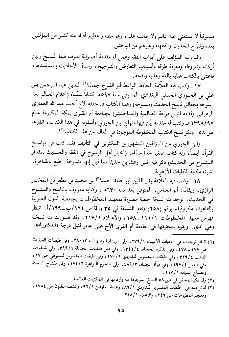 17 - وكتب فيه العلّامة الحافظ الواعظ أبو الفرج جمال (¬1) الدين عبد الرحمن بن علي بن الجوزي الحنبلي البغدادي المتوفى سنة 597 هـ كتابًا سمّاة (أعلام العالم بعد رسوخه بحقائق ناسخ الحديث ومنسوخه) وهذا الكتاب قد حققه الأخ أحمد عبد الله العماري الزهراني وقدمه لنيل درجة العالمية (الماجستير) بجامعة أم القرى بمكة المكرمة عام 97/ 1398 هـ وكتب له مقدمة بيّن فيها منهاج ابن الجوزي وأسلوبه في هذا الكتاب، انظرها ص 58. وذكر نسخ الكتاب المخطوطة الموجودة في العالم من هذا الكتاب (¬2).