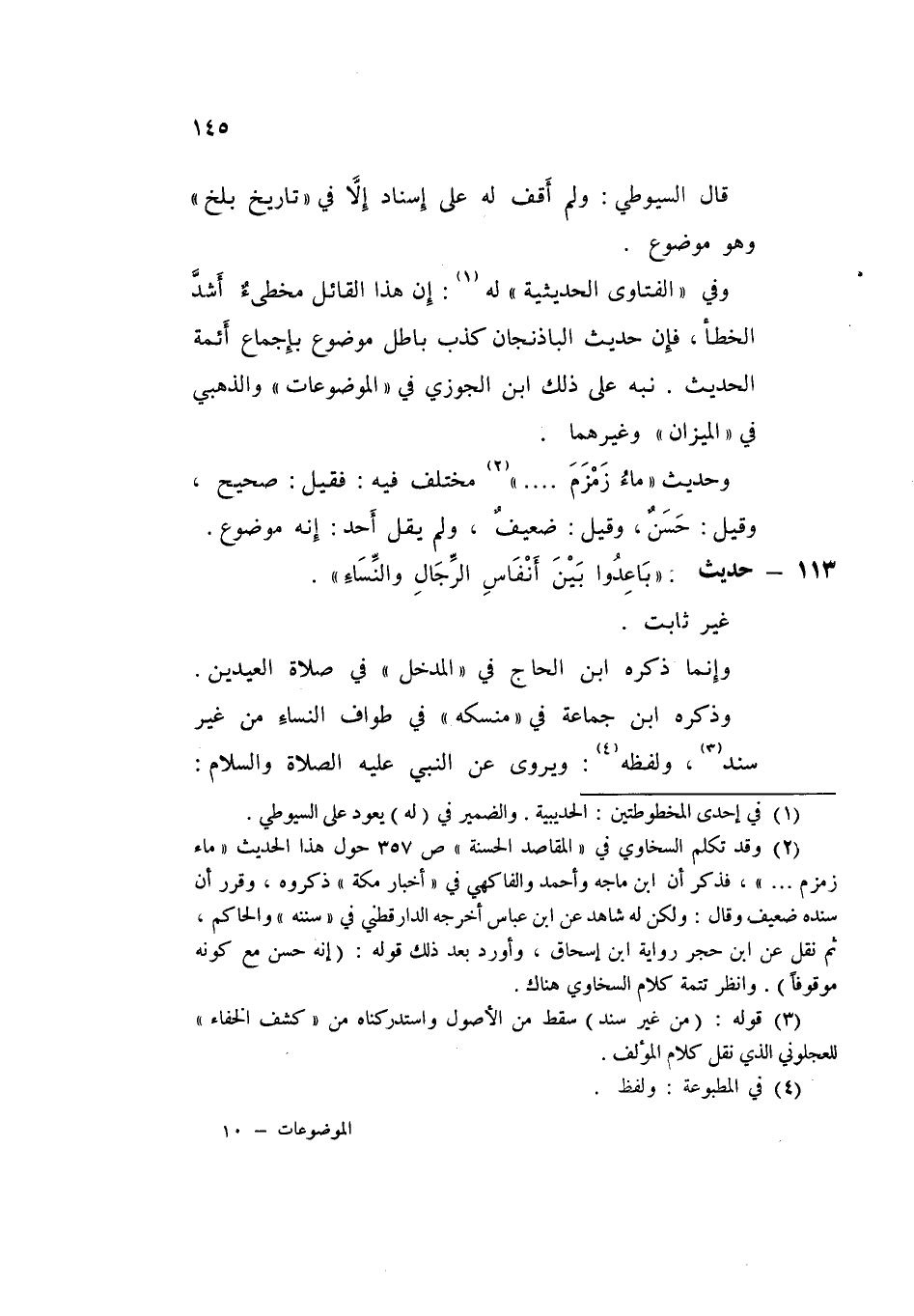 قَالَ السُّيُوطِيُّ وَقَدْ عَدَّ الْحَدِيثَ فِي الْمَوْضُوعَاتِ وَتَعَقَّبَهُ شَيْخُ الْإِسْلَام ابْن حجر بِأَن الْمَدِينِيِّ أَثْنَى عَلَى مَرَاسِيلِ الْحَسَنِ وَالْإِسْنَادُ حَسَنٌ إِلَيْهِ