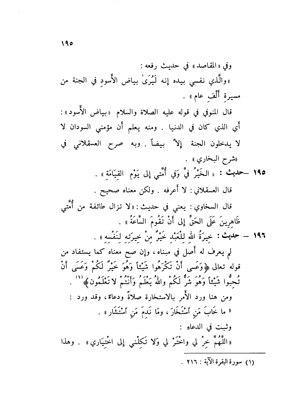 فِي الْمَقَاصِدِ جَزَمَ شَيْخُنَا وَغَيْرُهُ بِأَنَّهُ مَوْضُوعٌ وَإِنَّمَا هُوَ مِنْ كَلَامِ بَعْضِ السَّلَفِ وَرُبَّمَا أُورِدَ بِلَفْظِ