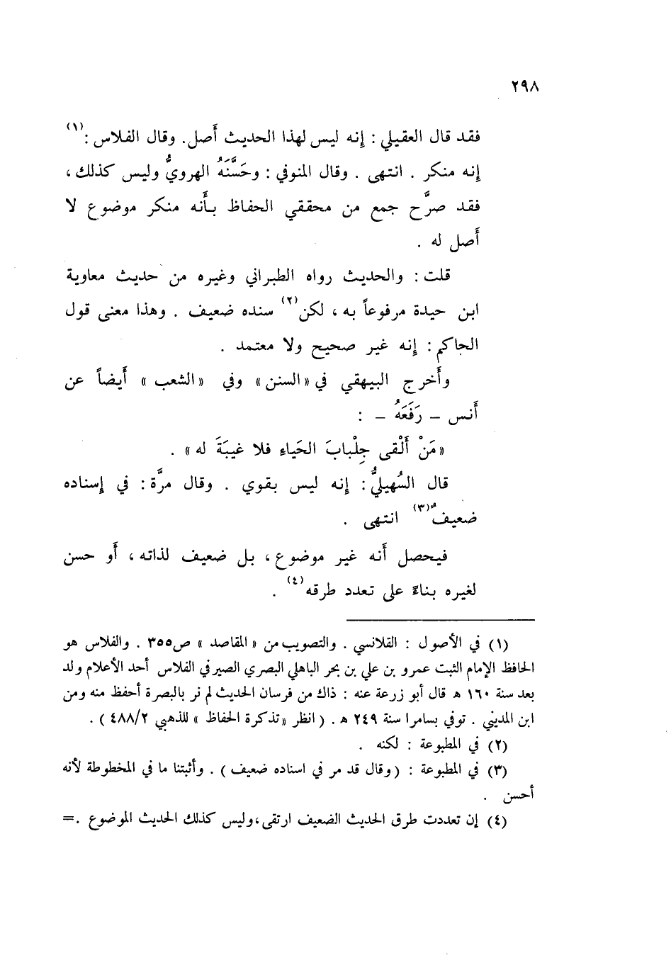 وَقَالَ السَّخَاوِيُّ بَلْ هُوَ مَوْضُوعٌ أَوْرَدَهُ ابْنُ الْجَوْزِيِّ فِي الْمَوْضُوعَاتِ