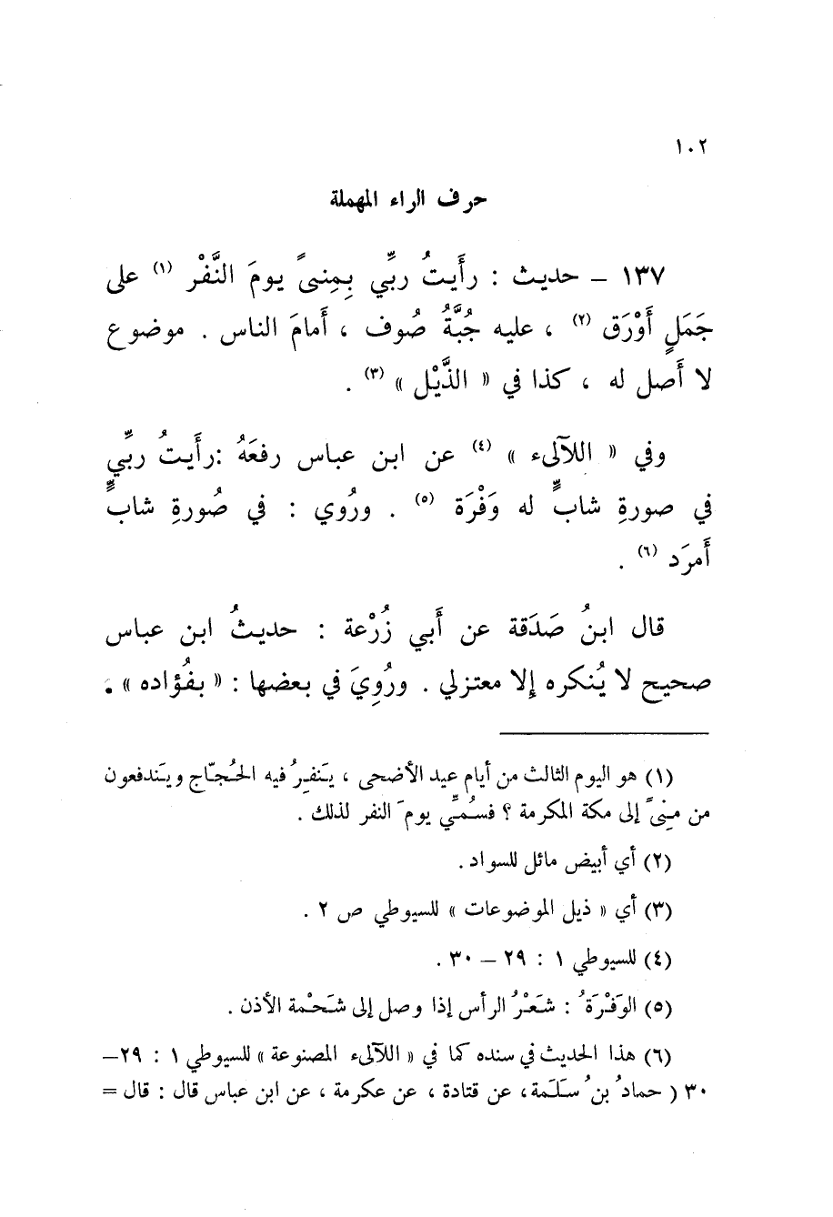 137 - حَدِيثُ رَأَيْتُ رَبِّي بِمِنًى يَوْمَ النَّفْرِ عَلَى جَمَلٍ أَوْرَقَ عَلَيْهِ جُبَّةُ صُوفٍ أَمَامَ النَّاسِ مَوْضُوعٌ لَا أَصْلَ لَهُ كَذَا فِي الذيل