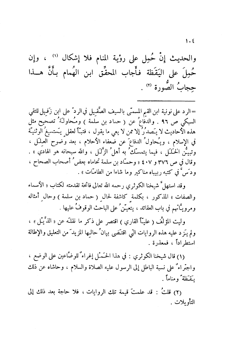 وَالْحَدِيثُ إِنْ حُمِلَ عَلَى رُؤْيَةِ الْمَنَامِ فَلا إِشْكَالَ وَإِنْ حُمِلَ عَلَى الْيَقَظَةِ فَأَجَابَ الْمُحَقِّقُ ابْنُ الْهَمَّامِ بِأَنَّ هَذَا حِجَابُ الصُّورَةِ
