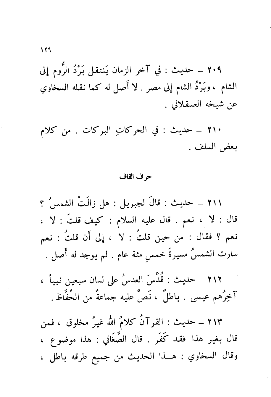 213 - حَدِيثُ الْقُرْآنُ كَلامُ اللَّهِ غَيْرُ مَخْلُوقٍ فَمَنْ قَالَ بِغَيْرِ هَذَا فَقَدْ كَفَرَ قَالَ الصَّغَانِيُّ هَذَا مَوْضُوعٌ وَقَالَ السَّخَاوِيُّ هَذَا الْحَدِيثُ مِنْ جَمِيعِ طُرُقِهِ بَاطِلٌ وَأَوْرَدَهُ ابْنُ الْجَوْزِيِّ فِي الْمَوْضُوعَاتِ