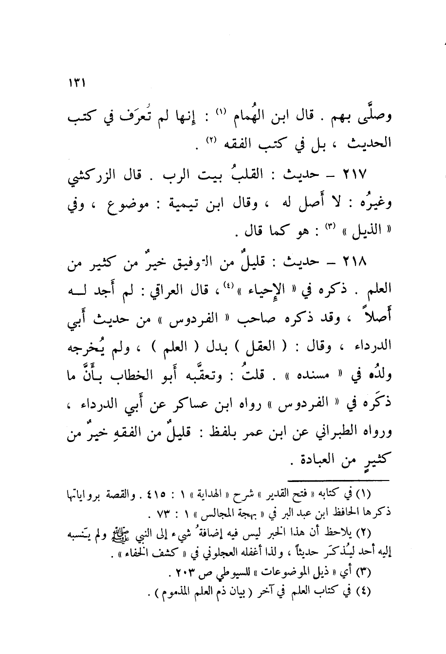 218 - حَدِيثُ قَلِيلٌ مِنَ التَّوْفِيقِ خَيْرٌ مِنْ كَثِيرٍ مِنَ الْعِلْمِ ذِكْرُهُ فِي الإِحْيَاءِ قَالَ الْعِرَاقِيُّ لَمْ أَجِدْ لَهُ أَصْلا وَقَدْ ذَكَرَهُ صَاحِبُ الْفِرْدَوْسِ مِنْ حَدِيثِ أَبِي الدَّرْدَاءِ وَقَالَ الْعَقْلَ بَدَلَ الْعِلْمِ وَلَمْ يُخْرِجْهُ وَلَدُهُ فِي مُسْنَدِهِ قُلْتُ وَتَعَقَّبُهُ أَبُو الْخَطَّابِ بِأَنَّ مَا ذَكَرَهُ فِي الْفِرْدَوْسِ رَوَاهُ ابْنُ عَسَاكِرَ عَنْ أَبِي الدَّرْدَاءِ وَرَوَاهُ الطَّبَرَانِيُّ عَنِ ابْنِ عُمَرَ بِلَفْظِ قَلِيلٌ مِنَ الْفِقْهِ خَيْرٌ مِنْ كَثِيرٍ مِنَ الْعِبَادَةِ