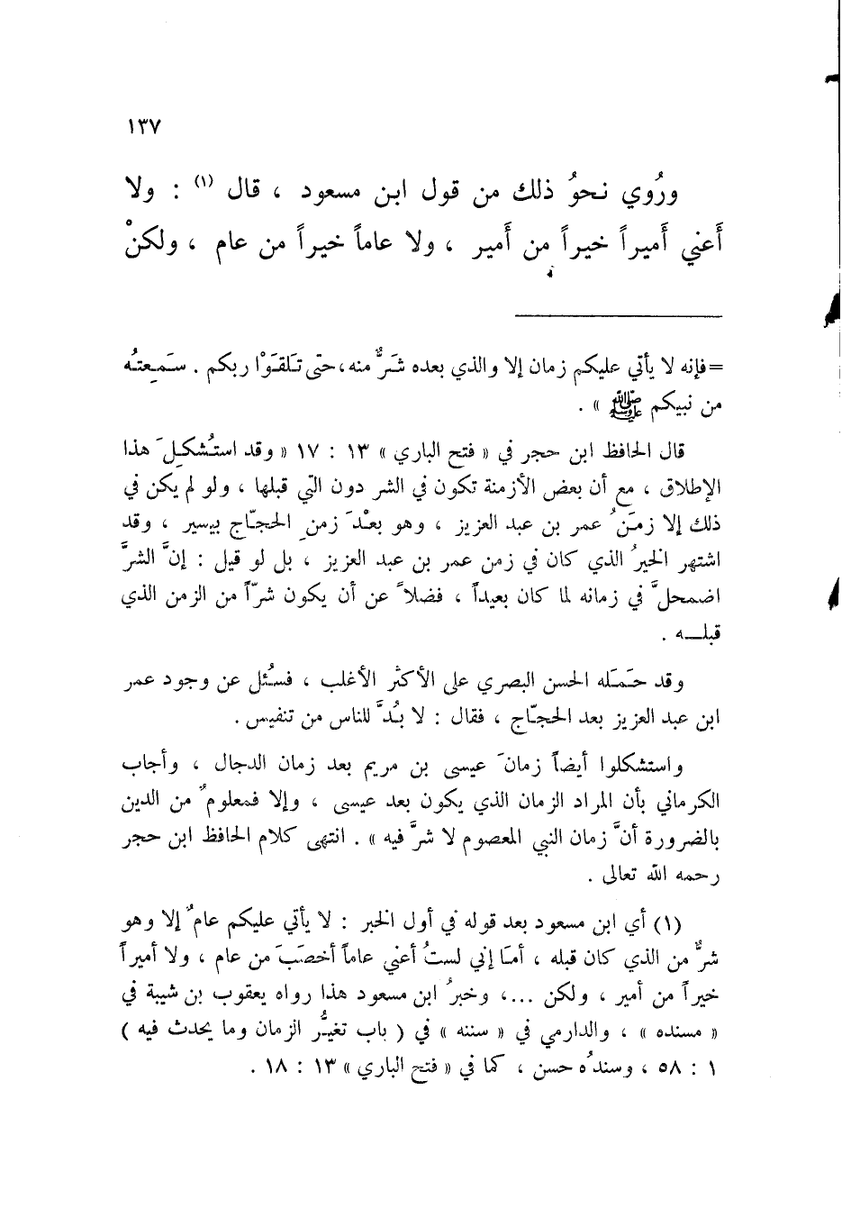 وَرُوِيَ نَحْوُ ذَلِكَ مِنْ قَوْلِ ابْنِ مَسْعُودٍ قَالَ وَلا أَعْنِي أَمِيرًا خَيْرًا مِنْ أَمِيرٍ وَلا عَامًا خَيْرًا مِنْ عَامٍ وَلَكِنْ