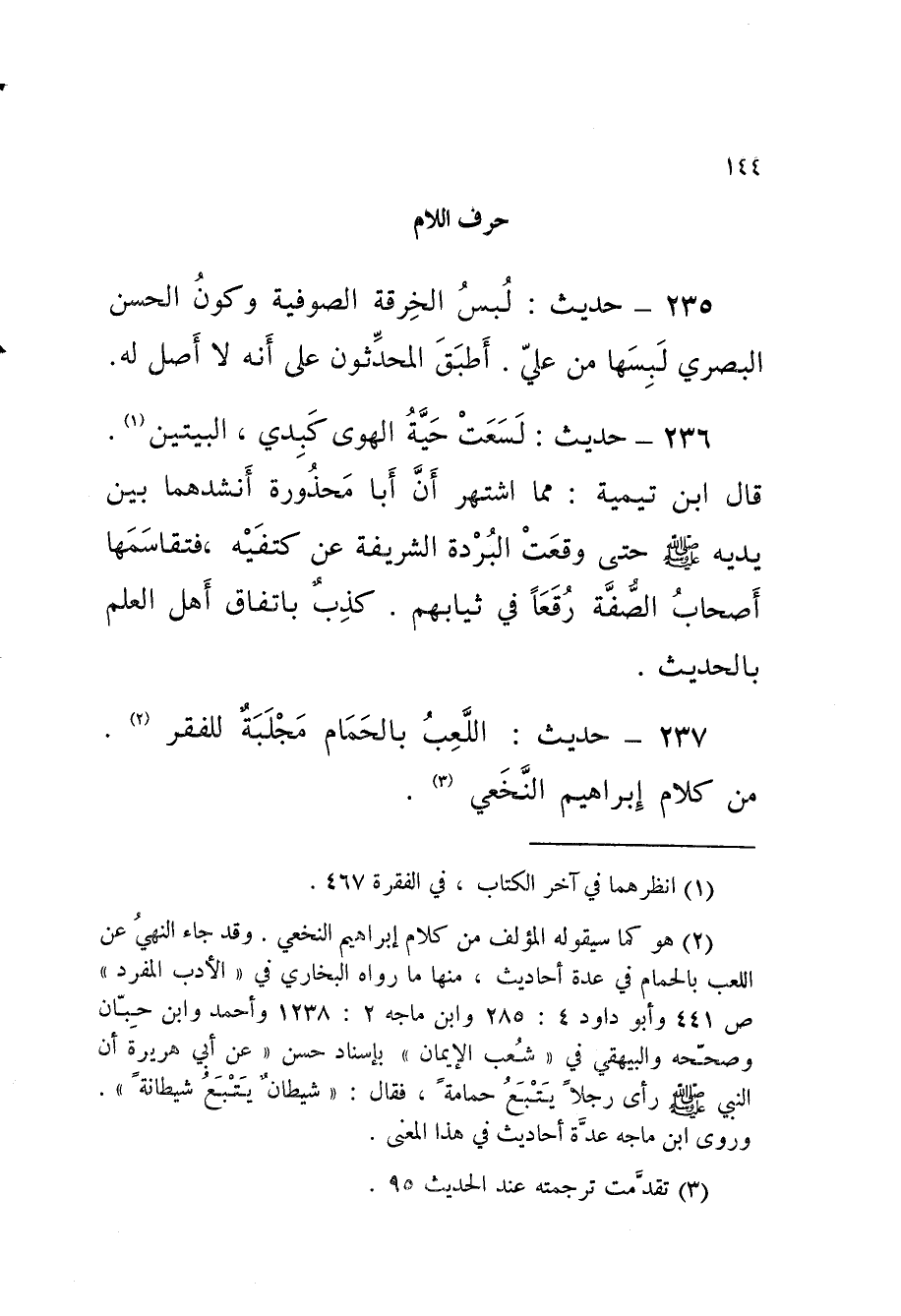 236 - حَدِيثُ لَسَعَتْ حَيَّةُ الْهَوَى كَبِدِي الْبَيْتَيْنِ قَالَ ابْنُ تَيْمِيَّةَ مِمَّا اشْتُهِرَ أَنَّ أَبَا مَحْذُورَةَ أَنْشَدَهُمَا بَيْنَ يَدَيْهِ صَلَّى اللَّهُ عَلَيْهِ وَسَلَّمَ حَتَّى وَقَعَتِ الْبُرْدَةُ الشَّرِيفَةُ عَنْ كَتِفَيْهِ فَتَقَاسَمَهَا أَصْحَابُ الصُّفَّةِ رُقَعًا فِي ثِيَابِهِمْ كَذِبٌ بِاتِّفَاقِ أَهْلِ الْعِلْمِ بِالْحَدِيثِ
