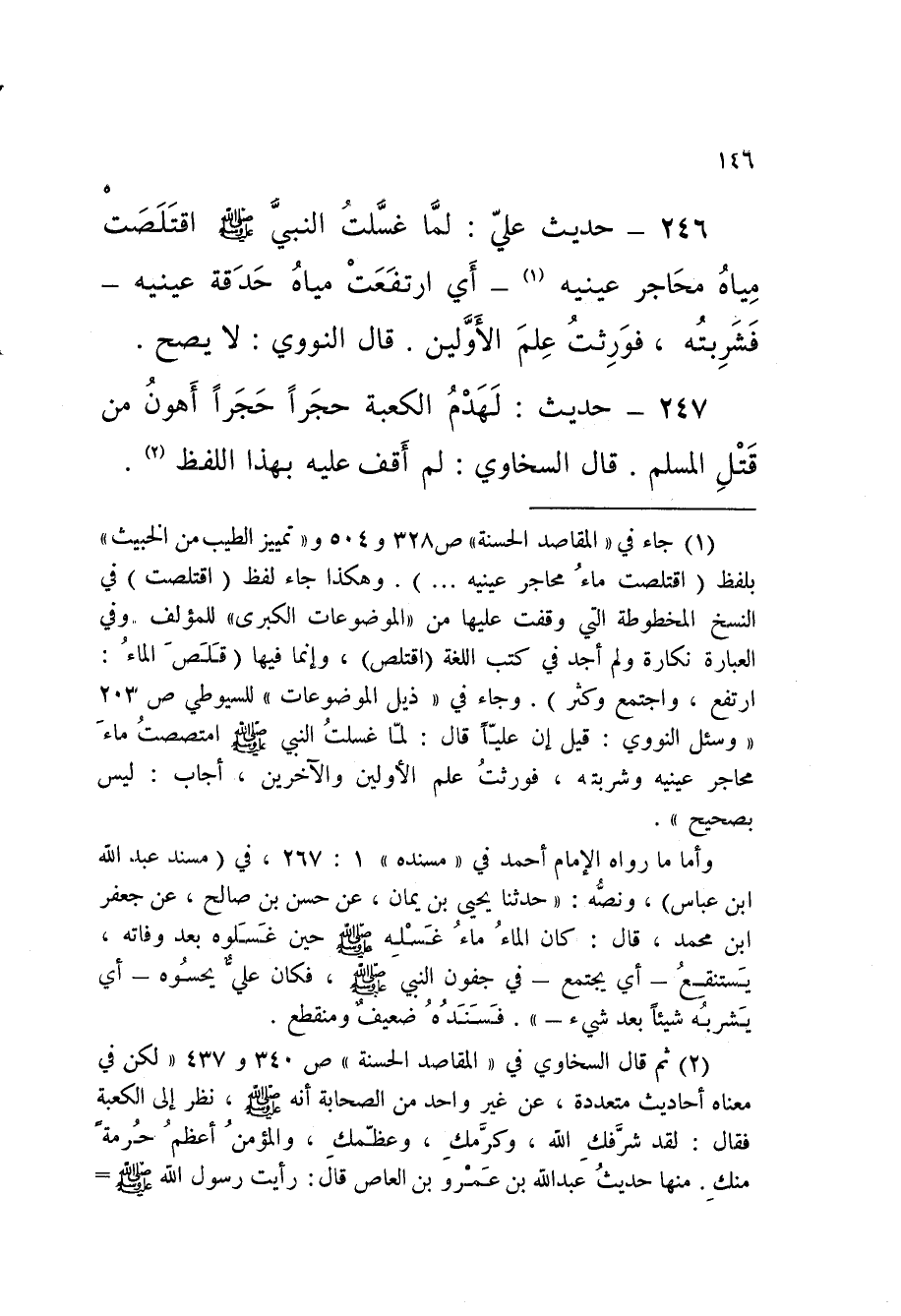246 - حَدِيث حَدِيثُ عَلِيٍّ لَمَّا غَسَّلْتُ النَّبِيَّ صَلَّى اللَّهُ عَلَيْهِ وَسَلَّمَ اقْتَلَصْتُ مِيَاهَ مَحَاجِرِ عَيْنَيْهِ أَيِ ارْتَفَعَتْ مِيَاهُ حَدَقَةِ عَيْنَيْهِ فَشَرِبْتُهُ فَوَرِثْتُ عِلْمَ الأَوَّلِينَ قَالَ النَّوَوِيُّ لَا يَصِحُّ
