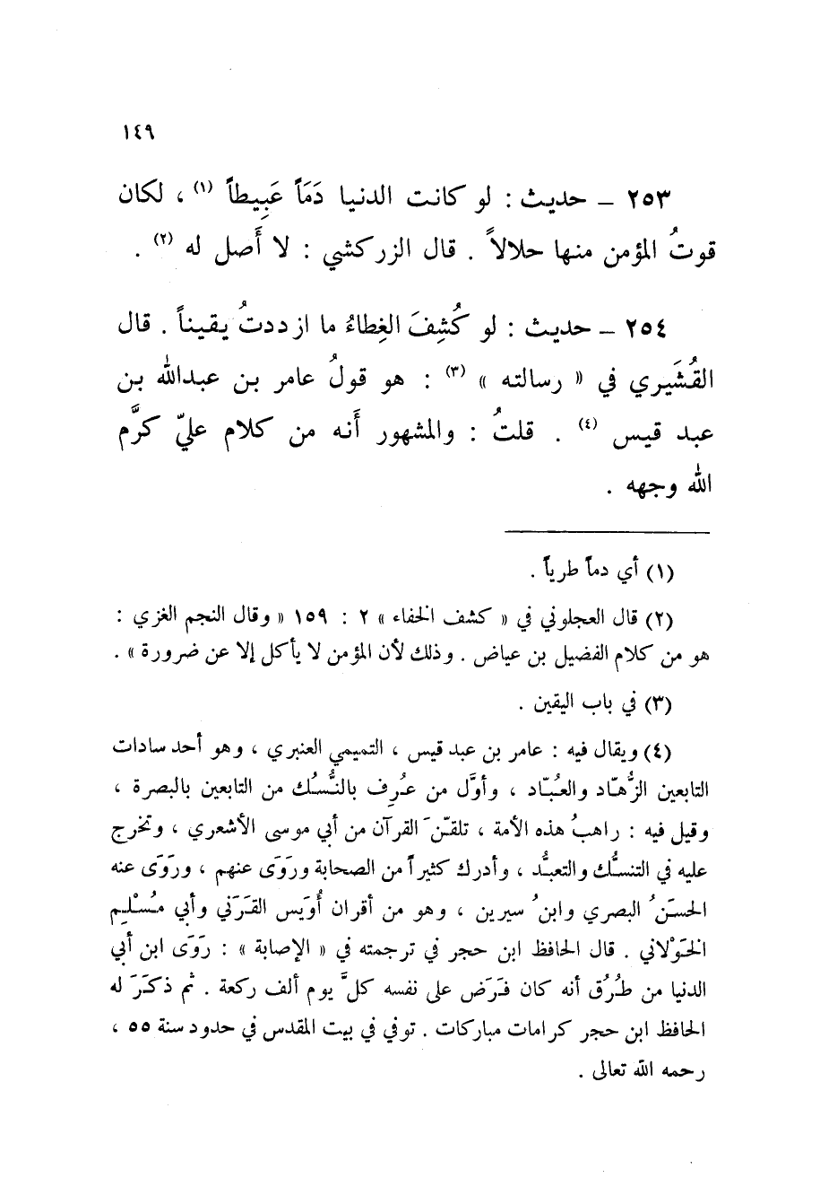 254 - حَدِيثُ لَوْ كُشِفَ الْغِطَاءُ مَا ازْدَدْتُ يَقِينًا قَالَ الْقُشَيْرِيُّ فِي رِسَالَتِهِ هُوَ قَوْلُ عَامِرِ بْنِ عَبْدِ اللَّهِ بْنِ عَبْدِ قَيْسٍ قُلْتُ وَالْمَشْهُورُ أَنَّهُ مِنْ كَلامِ عَلِيٍّ كرم الله وَجهه