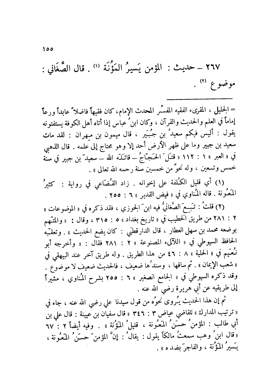 267 - حَدِيثُ الْمُؤْمِنُ يَسِيرُ الْمُؤْنَةِ قَالَ الصَّغَانِيُّ مَوْضُوعٌ