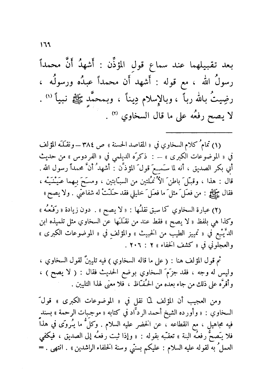 بَعْدَ تَقْبِيلِهِمَا عِنْدَ سَمَاعِ قَوْلِ الْمُؤَذِّنِ أَشْهَدُ أَنَّ مُحَمَّدًا رَسُولُ اللَّهِ مَعَ قَوْلِهِ أَشْهَدُ أَنَّ مُحَمَّدًا عَبْدُهُ وَرَسُولُهُ رَضِيتُ بِاللَّهِ رَبًّا وَبِالإِسْلامِ دِينًا وَبِمُحَمَّدٍ صَلَّى اللَّهُ عَلَيْهِ وَسَلَّمَ نَبِيًّا لَا يَصِحُّ رَفْعُهُ عَلَى مَا قَالَ السَّخَاوِيُّ