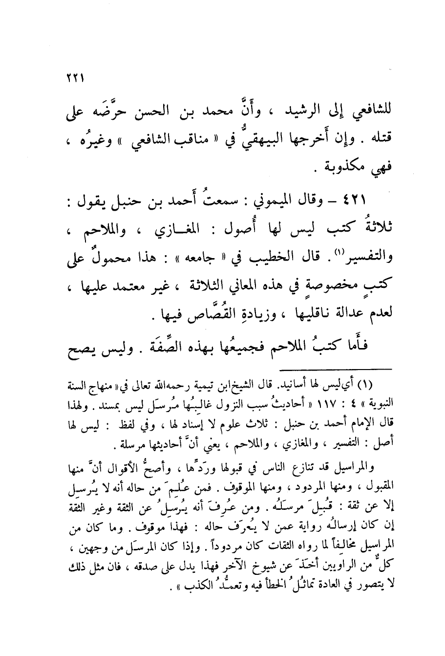 421 - حَدِيث وَقَالَ الْمَيْمُونِيُّ سَمِعْتُ أَحْمَدَ بْنَ حَنْبَلٍ يَقُولُ ثَلاثَةُ كُتُبٍ لَيْسَ لَهَا أُصُولٌ الْمَغَازِي وَالْمَلاحِمُ وَالتَّفْسِيرُ قَالَ الْخَطِيبُ فِي جَامِعِهِ هَذَا مَحْمُولٌ عَلَى كُتُبٍ مَخْصُوصَةٍ فِي هَذِهِ الْمَعَانِي الثَّلاثَةِ غَيْرِ مُعْتَمَدٍ عَلَيْهَا لِعَدَمِ عَدَالَةِ نَاقِلِيهَا وَزِيَادَةِ الْقُصَّاصِ فِيهَا