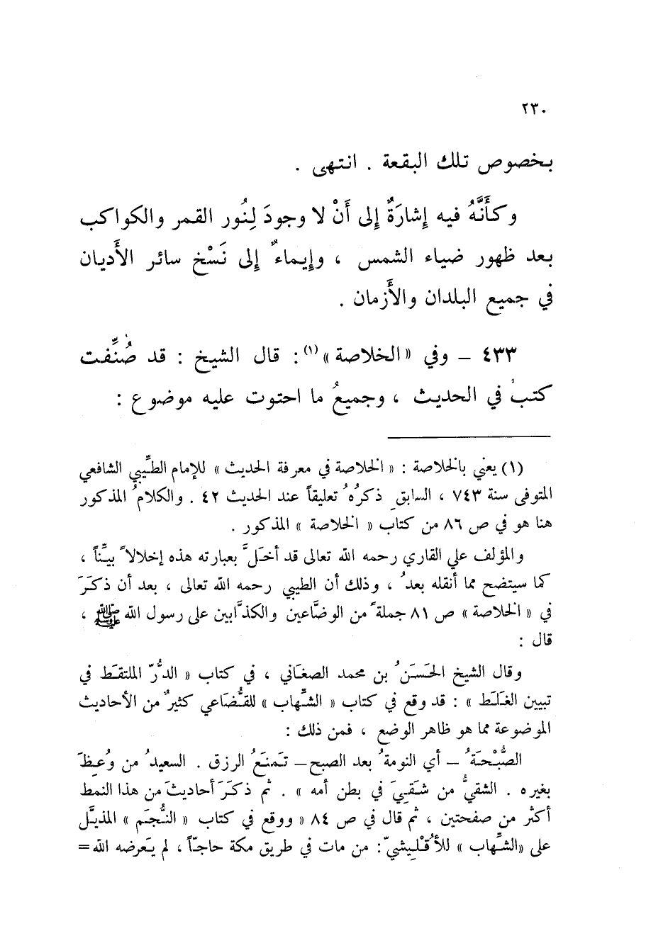433 - حَدِيث وَفِي الْخُلاصَةِ قَالَ الشَّيْخُ قَدْ صُنِّفَتْ كُتُبٌ فِي الْحَدِيثِ وَجَمِيعُ مَا احْتَوَتْ عَلَيْهِ مَوْضُوعٌ
