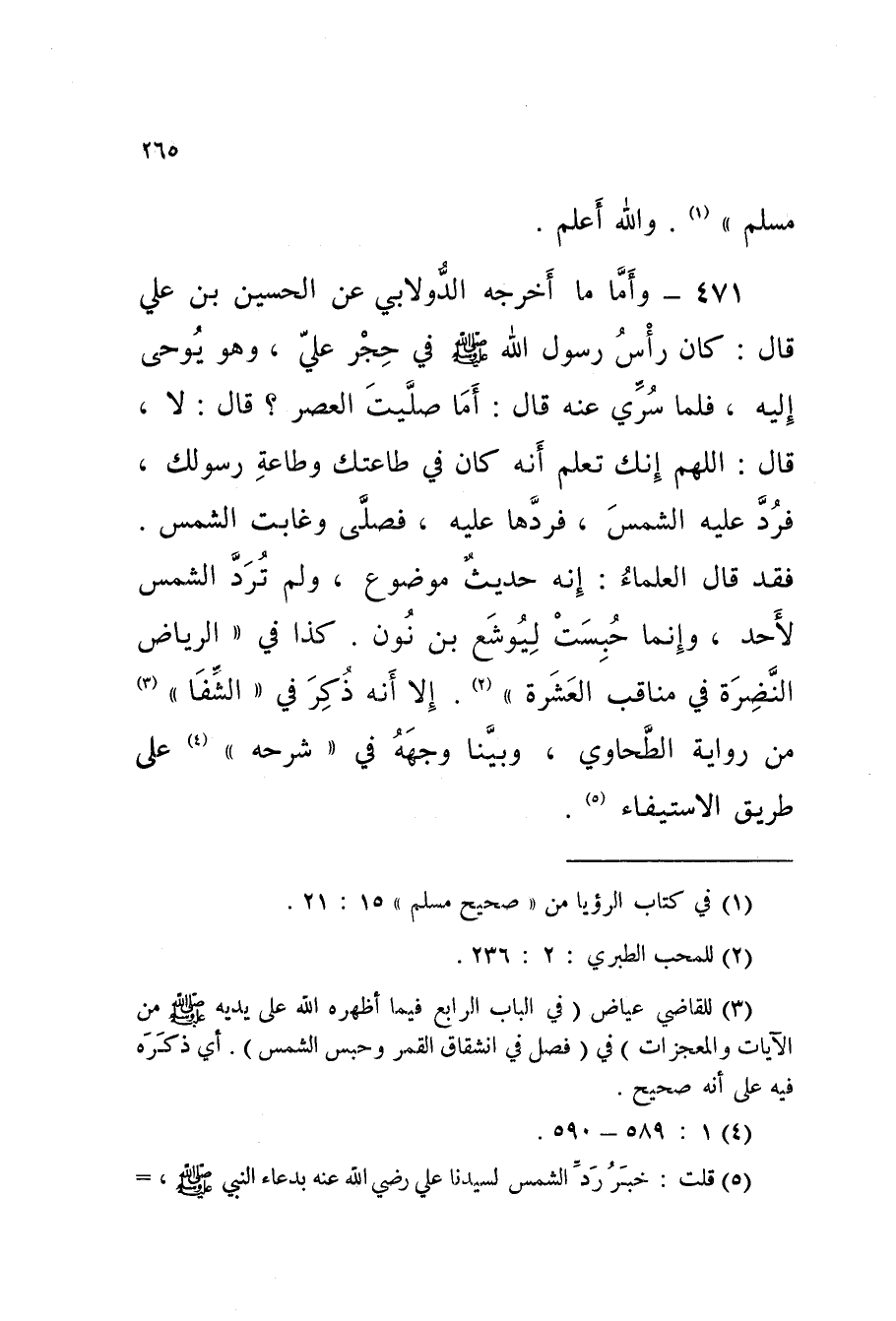 471 - حَدِيث وَأَمَّا مَا أَخْرَجَهُ الدَّوْلابِيُّ عَنِ الْحُسَيْنِ بْنِ عَلِيٍّ قَالَ كَانَ رَأْسُ رَسُولِ اللَّهِ صَلَّى اللَّهُ عَلَيْهِ وَسَلَّمَ فِي حِجْرِ عَلِيٍّ وَهُوَ يُوحَى إِلَيْهِ فَلَمَّا سُرِّيَ عَنْهُ قَالَ أَمَا صَلَّيْتَ الْعَصْرَ قَالَ لَا قَالَ اللَّهُمَّ إِنَّكَ تَعْلَمُ أَنَّهُ كَانَ فِي طَاعَتِكَ وَطَاعَةِ رَسُولِكَ فَرُدَّ عَلَيْهِ الشَّمْسَ فَرَدَّهَا عَلَيْهِ فَصَلَّى وَغَابَتِ الشَّمْسُ فَقَدْ قَالَ الْعُلَمَاءُ إِنَّهُ حَدِيثٌ مَوْضُوعٌ وَلَمْ تُرَدَّ الشَّمْسُ لأَحَدٍ وَإِنَّمَا حُبِسَتْ لِيُوشعَ بْنِ نُونٍ كَذَا فِي الرِّيَاضِ النَّضِرَةِ فِي مَنَاقِبِ الْعَشَرَةِ إِلا إِنَّهُ ذُكِرَ فِي الشّفَا من رِوَايَة الطَّحَاوِيّ وَبينا فِي شَرْحِهِ عَلَى طَرِيقِ الاسْتِيفَاءِ