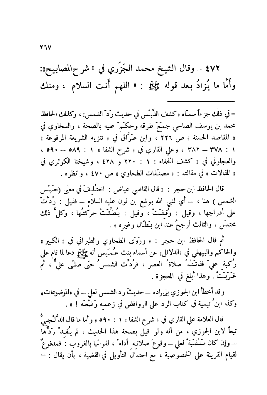 472 - وَقَالَ الشَّيْخُ مُحَمَّدٌ الْجَزَرِيُّ فِي شَرْحِ الْمَصَابِيحِ وَأَمَّا مَا يُزَادُ بَعْدَ قَوْلِهِ صَلَّى اللَّهُ عَلَيْهِ وَسَلَّمَ اللَّهُمَّ أَنْتَ السَّلامُ وَمِنْكَ السَّلامُ مِنْ نَحْوِ وَإِلَيْكَ يَرْجِعُ السَّلامُ فَحَيِّنَا رَبَّنَا بِالسَّلامِ وَأَدْخِلْنَا دَارَ السَّلامِ فَلا أَصْلَ لَهُ بل هُوَ مختلق بعض الْقصاص