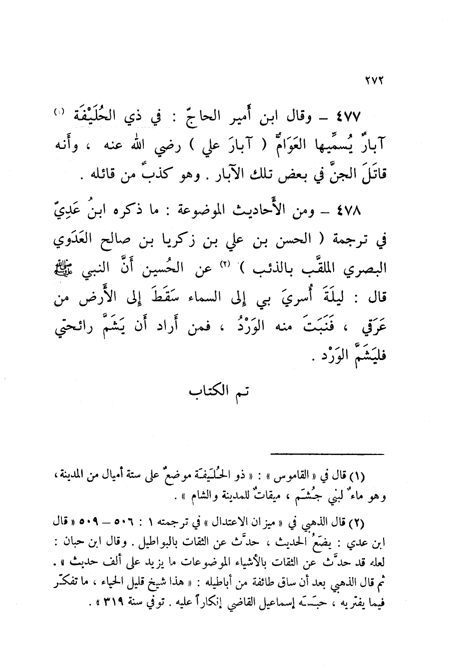 477 - حَدِيث وَقَالَ ابْنُ أَمِيرِ الْحَاجِّ فِي ذِي الْحُلَيْفَةِ آبَارٌ يُسَمِّيهَا الْعَوَامُّ آبَارَ عَلِيٍّ رَضِيَ اللَّهُ عَنْهُ وَأَنَّهُ قَاتَلَ الْجِنَّ فِي بَعْضِ تِلْكَ الْآبَار وَهُوَ كذب من قَائِله