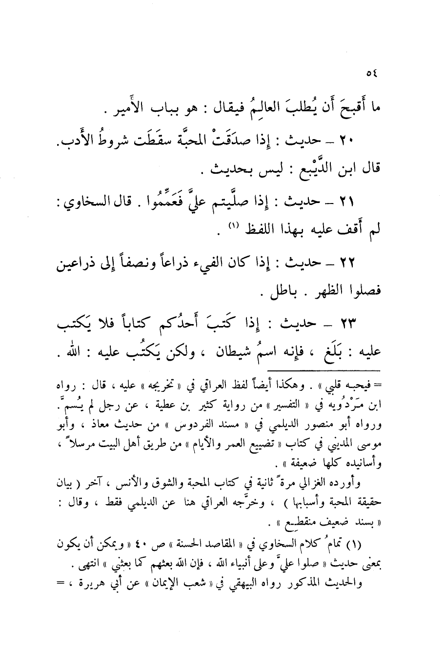 23 - حَدِيثُ إِذَا كَتَبَ أَحَدُكُمْ كِتَابًا فَلا يَكْتُبْ عَلَيْهِ بَلَغ فَإِنَّهُ اسْمُ شَيْطَانٍ وَلَكِنْ يَكْتُبُ عَلَيْهِ الله مَوْضُوع كَذَا فِي اللآلىء
