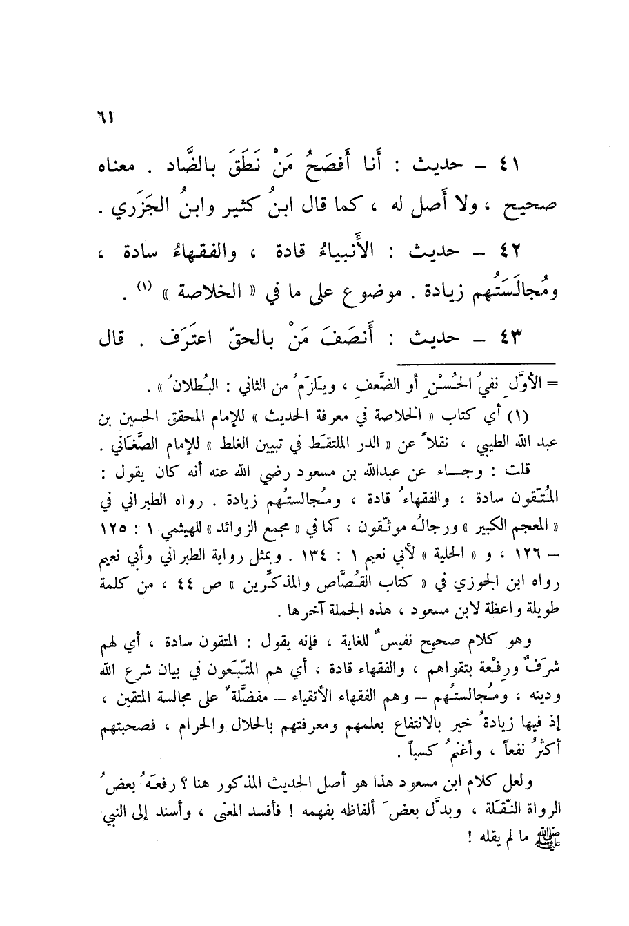 42 - حَدِيثُ الأَنْبِيَاءُ قَادَةٌ وَالْفُقَهَاءُ سَادَةٌ وَمُجَالَسَتُهُمْ زِيَادَةٌ مَوْضُوعٌ عَلَى مَا فِي الْخُلاصَةِ