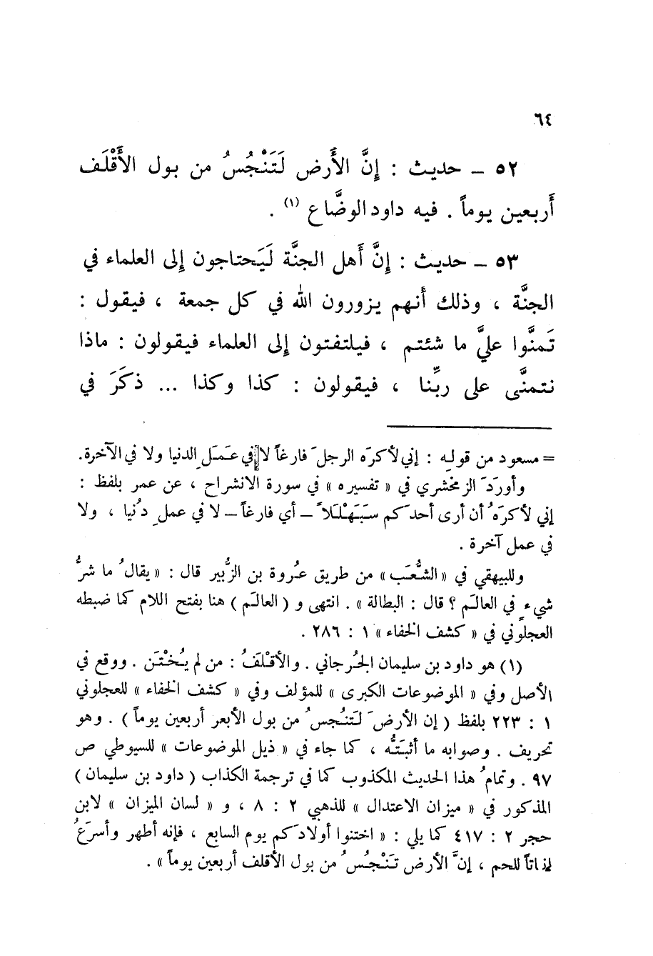 53 - حَدِيثُ إِنَّ أَهْلَ الْجَنَّةِ لَيَحْتَاجُونَ إِلَى الْعُلَمَاءِ فِي الْجَنَّةِ وَذَلِكَ أَنَّهُمْ يَزُورُونَ اللَّهَ فِي كُلِّ جُمُعَة فَيَقُول تمنوا عَليّ ماشئتم فَيَلْتَفِتُونَ إِلَى الْعُلَمَاءِ فَيَقُولُونَ مَاذَا نَتَمَنَّى عَلَى رَبِّنَا فَيَقُولُونَ كَذَا وَكَذَا ذُكِرَ فِي الْمِيزَانِ أَنه مَوْضُوع