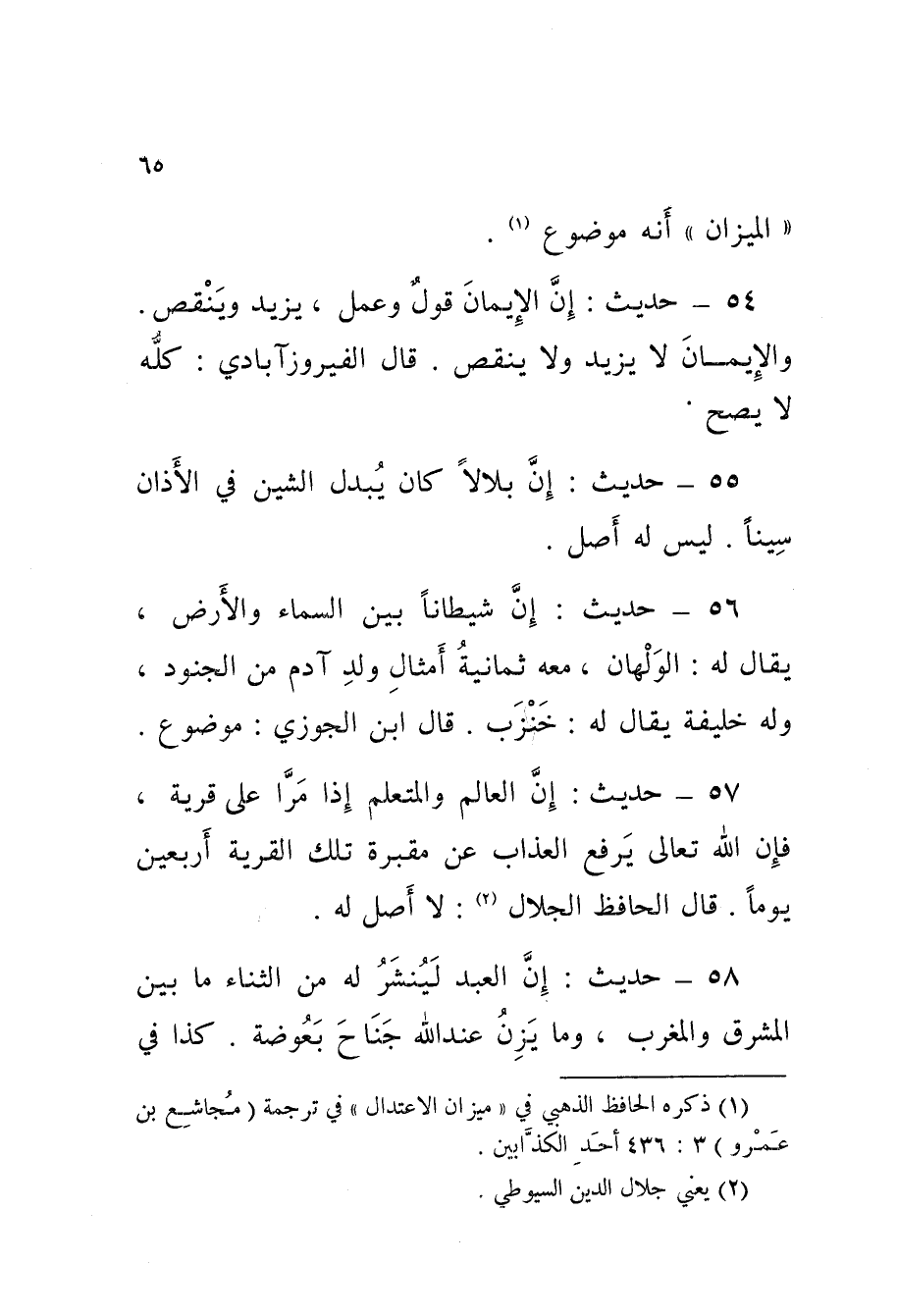 54 - حَدِيثُ إِنَّ الإِيمَانَ قَوْلٌ وَعَمَلٌ يَزِيدُ وَيَنْقُصُ وَالْإِيمَان لَا يزِيد وَلَا ينقص قَالَ الفيروز آبادي كُلُّهُ لَا يَصِحُّ