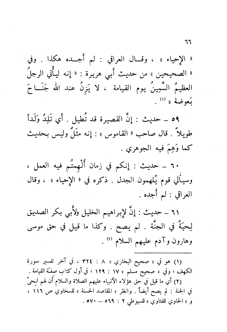 59 - حَدِيثُ إِنَّ الْقَصِيرَةَ قَدْ تُطِيلُ أَيْ تَلِدَ وَلَدًا طَوِيلا قَالَ صَاحِبُ الْقَامُوسِ إِنَّهُ مَثَلٌ وَلَيْسَ بِحَدِيثٍ كَمَا وَهِمَ فِيهِ الْجَوْهَرِيُّ