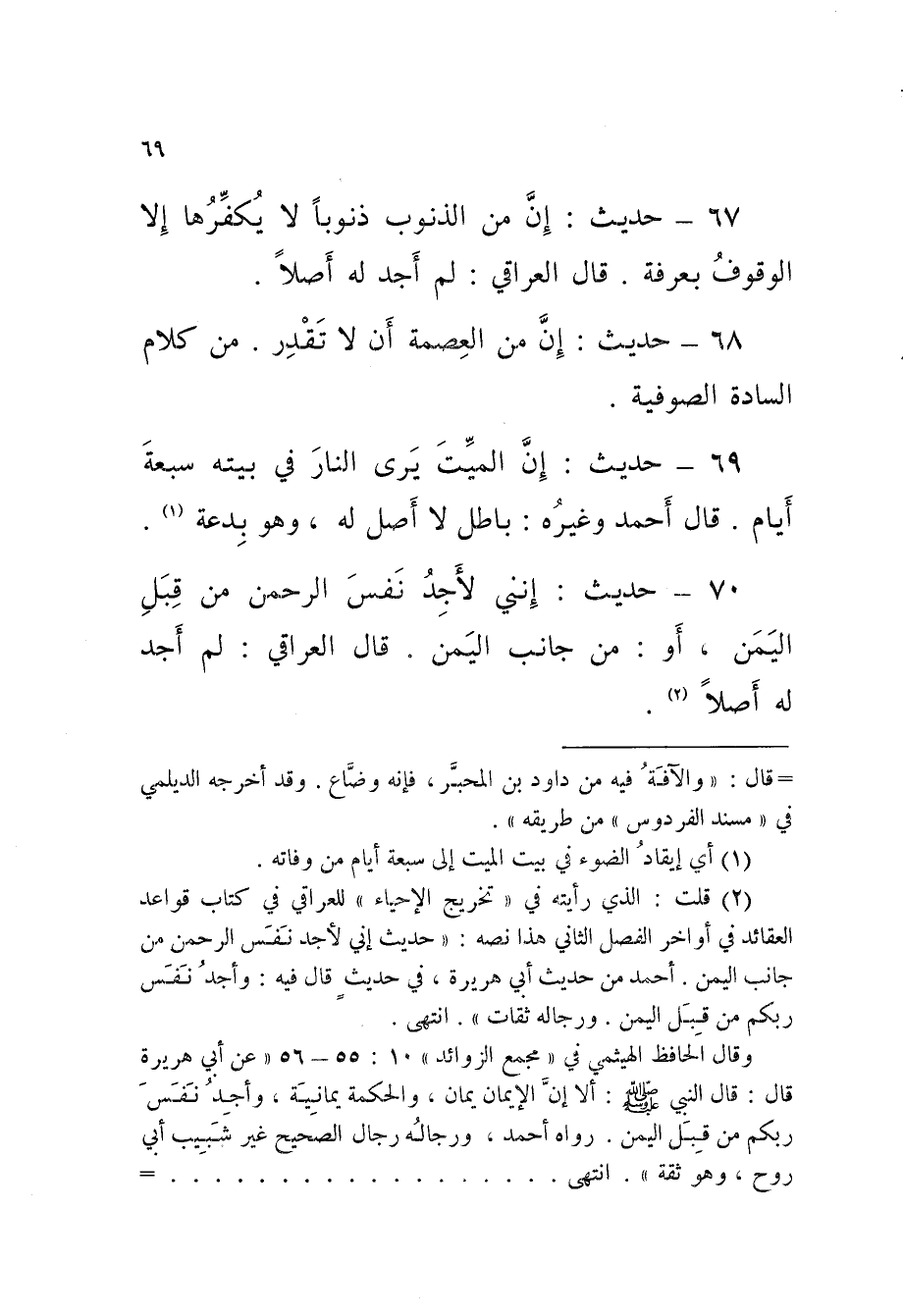 70 - حَدِيثُ إِنَّنِي لأَجِدُ نَفَسَ الرَّحْمَنِ مِنْ قِبَلِ الْيَمَنِ أَوْ مِنْ جَانِبِ الْيَمَنِ قَالَ الْعِرَاقِيُّ لَمْ أَجِدْ لَهُ أَصْلا