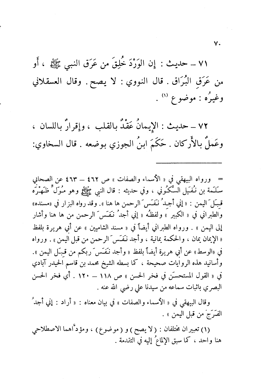 71 - حَدِيثُ إِنَّ الْوَرْدَ خُلِقَ مِنْ عَرَقِ النَّبِيِّ صَلَّى اللَّهُ عَلَيْهِ وَسَلَّمَ أَوْ مِنْ عَرَقِ الْبُرَاقِ قَالَ النَّوَوِيُّ لَا يَصِحُّ وَقَالَ الْعَسْقَلانِيُّ وَغَيْرُهُ مَوْضُوعٌ