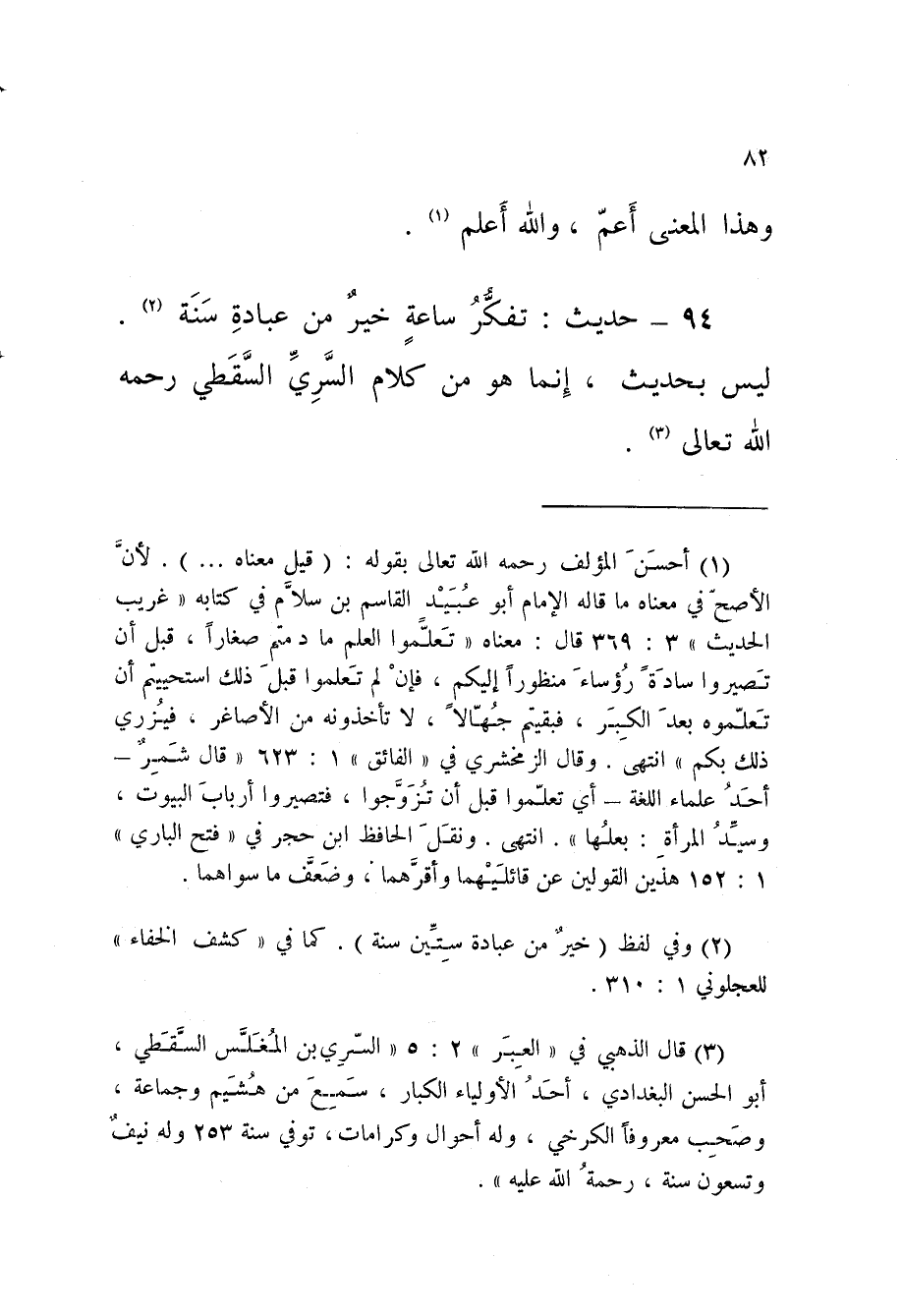 94 - حَدِيثُ تَفَكُّرُ سَاعَةٍ خَيْرٌ مِنْ عِبَادَةِ سَنَةٍ لَيْسَ بِحَدِيثٍ إِنَّمَا هُوَ مِنْ كَلامِ السُّرِّيِّ السَّقَطِيِّ رَحِمَهُ اللَّهُ تَعَالَى