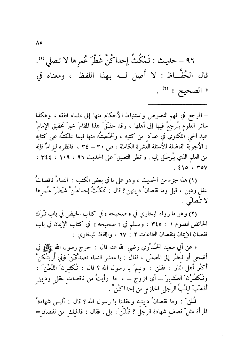 96 - حَدِيثُ تَمْكُثُ إِحْدَاكُنَّ شَطْرَ عُمْرِهَا لَا تُصَلِّي قَالَ الْحُفَّاظُ لَا أَصْلَ لَهُ بِهَذَا اللَّفْظِ وَمَعْنَاهُ فِي الصَّحِيح 00